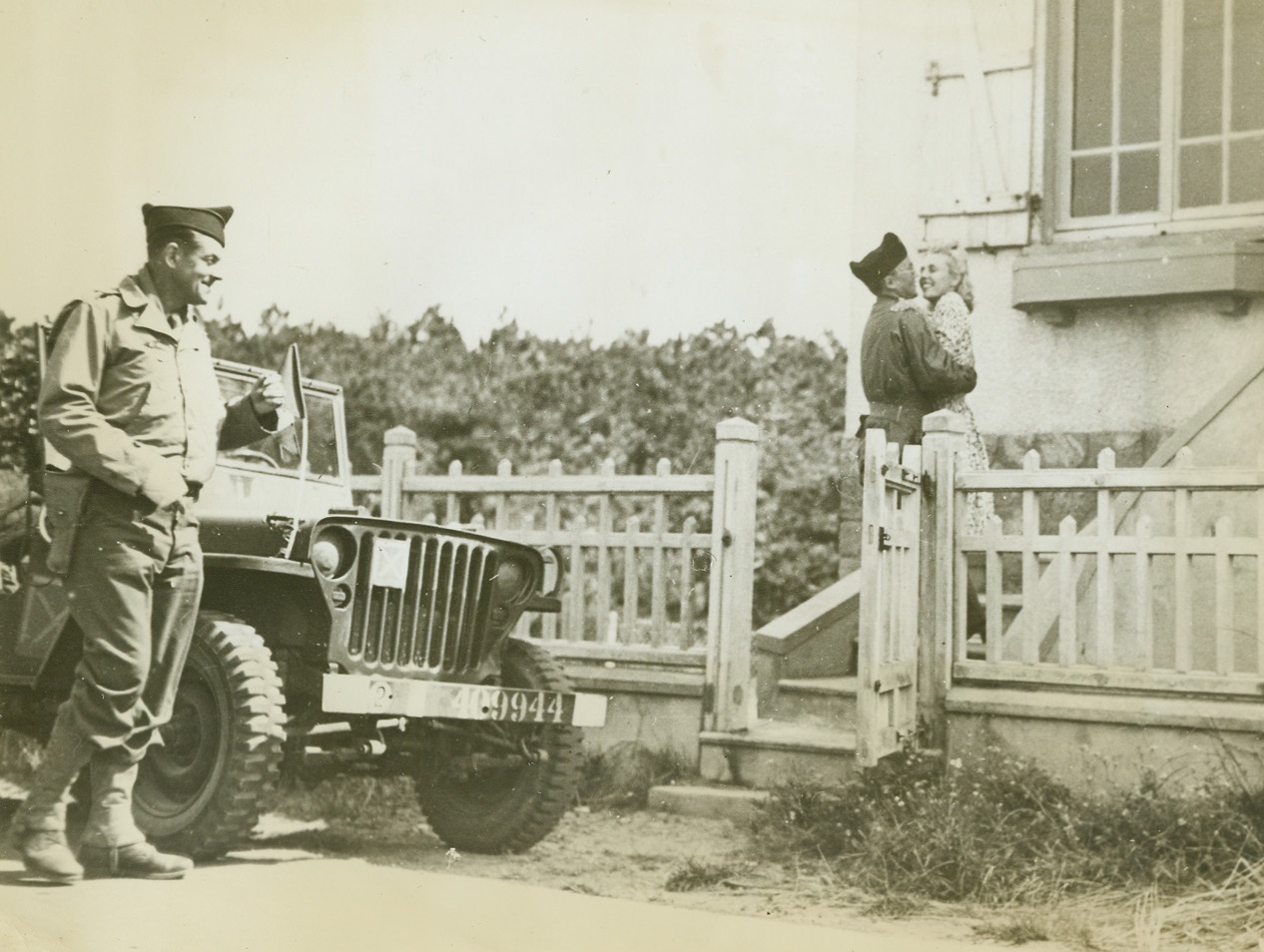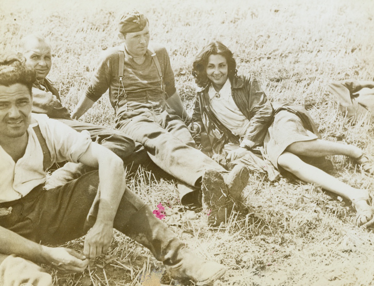 NEA Correspondent Does Himself Proud, 8/30/1944. France – Tom Wolf, NEA war correspondent, sits with his arm around a very beautiful French lassie whose heart he probably captured by offering her a lift in his jeep as liberating forces entered Paris. The blonde-haired beauty has her arm in a sling. Credit: ACME Photo by Bert Brandt, War Pool Correspondent;