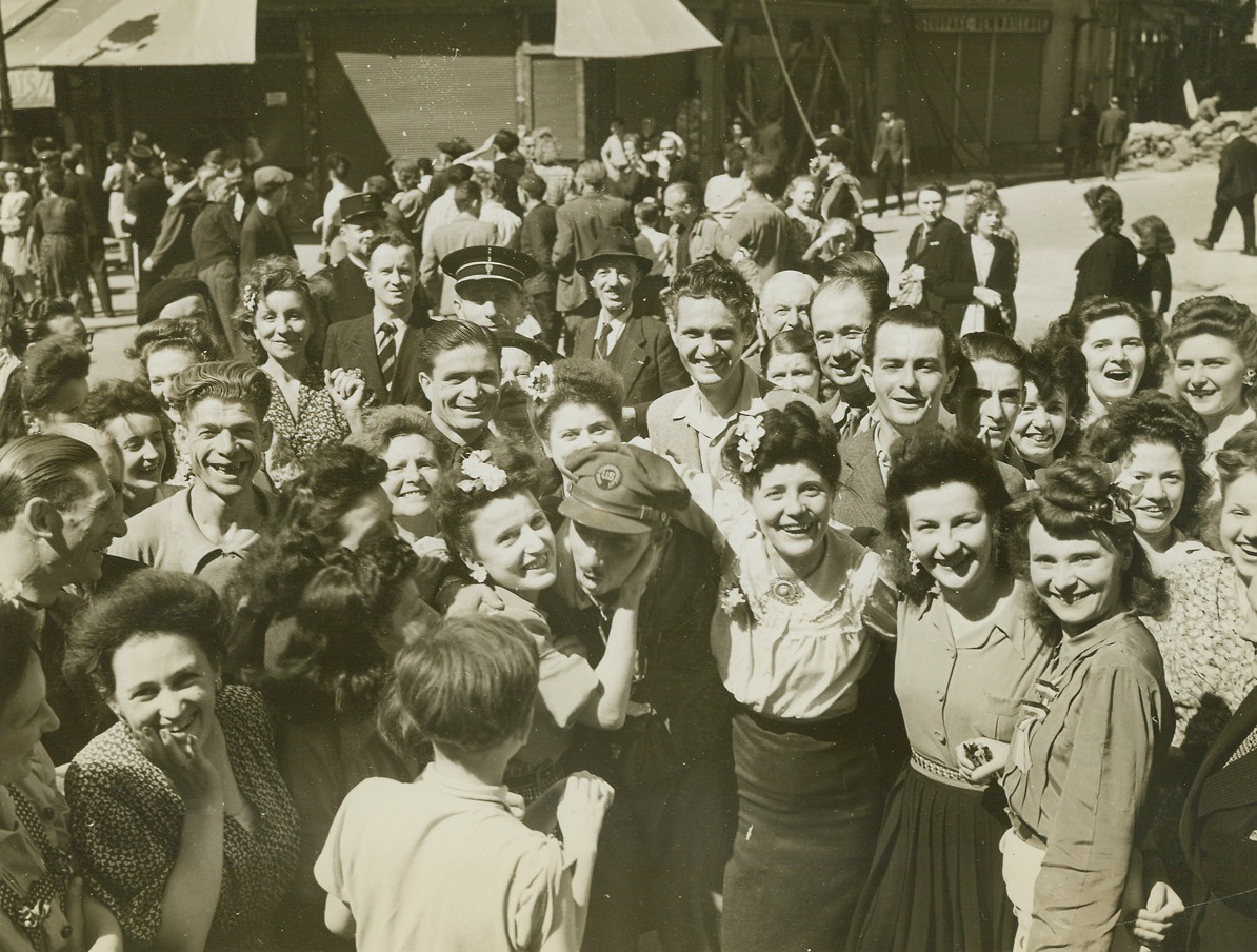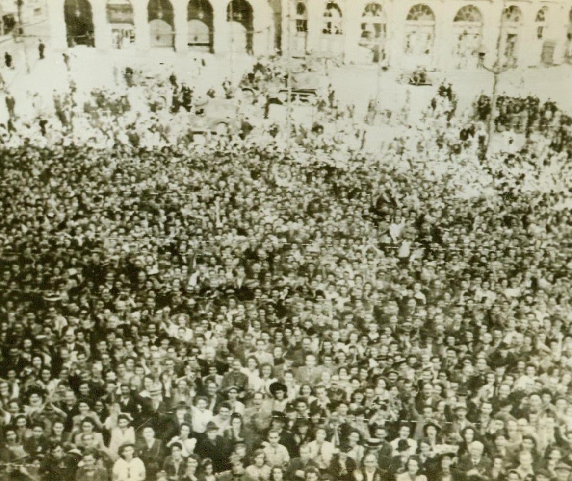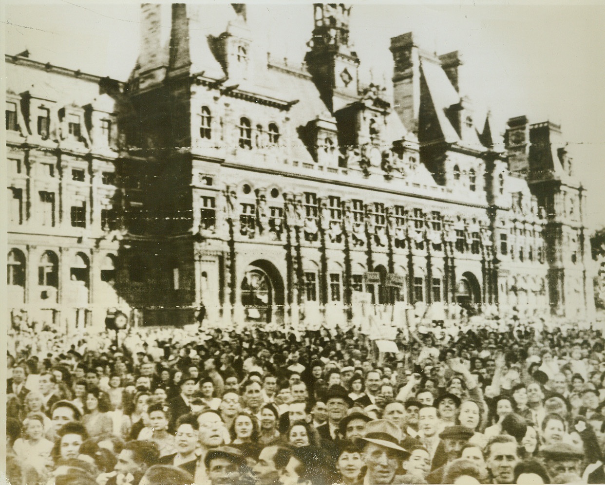 Celebrants Mass in Paris Streets, 8/28/1944. Paris—With faces reflecting the joy of being free once more, Parisians mass in front of the Hotel de Ville in Paris to celebrate the liberation of their city. Shortly afterward, as their voices raised in triumphant cheers for Gen. de Gaulle, shots rang out over their exuberant voices as snipers preyed on the assembly. The General, leading a triumphal procession, narrowly escaped death or injury. Credit: Signal Corps radiotelephoto from ACME;