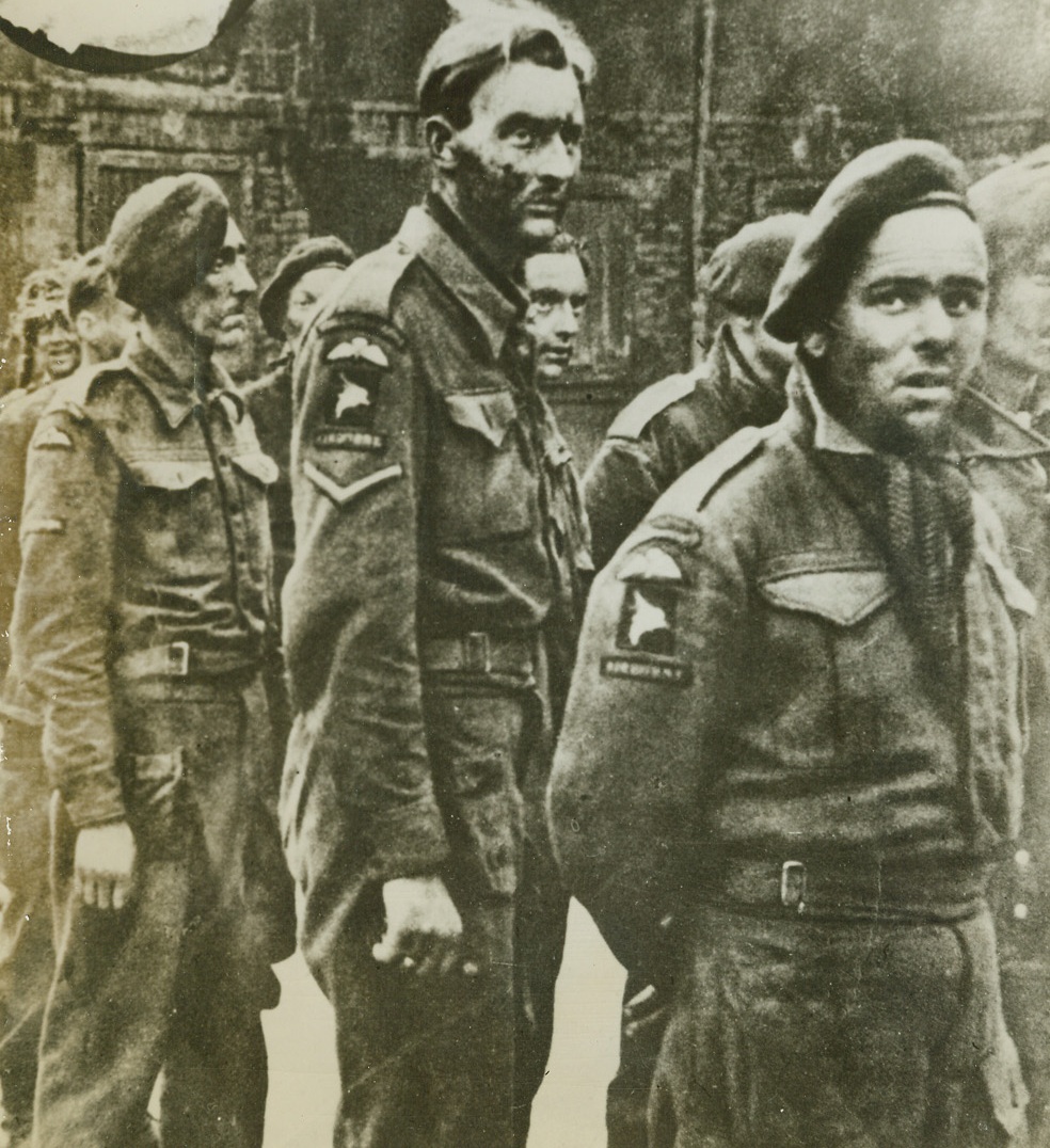 British Soldiers Captured in Normandy, 8/1/1944. Normandy, France – According to the German caption accompanying this photo received in London from a neutral source, these men are British soldiers who have been captured by the Germans in Normandy. Credit: ACME;