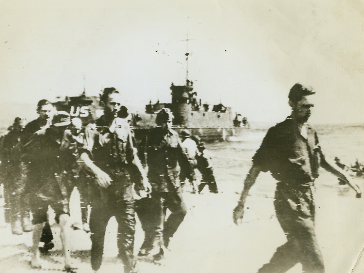 First Prisoners in New Invasion, 8/16/1944. France – As Allied troops come ashore from the LCIs in background, a group of Germans—first prisoners taken in the invasion of Southern France—march along the beach under guard. Credit: Army Radiotelephoto from ACME;
