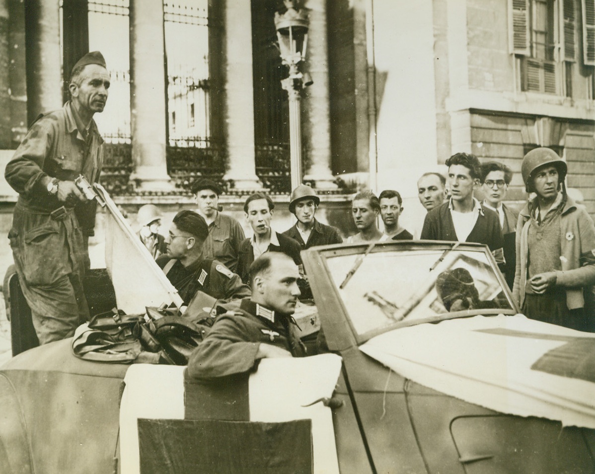 Sniper Hunt, 8/28/1944. PARIS — Scanning streets and rooftops, FFI warriors ride through Paris in captured German vehicles, hunting German snipers and French Fascists fighting last-ditch resistance in the French capital. Note the Cross of Lorraine painted on the bumper of the captured truck in foreground. Credit: – WP- (ACME Photo by Andy Lopez for the War Picture Pool);