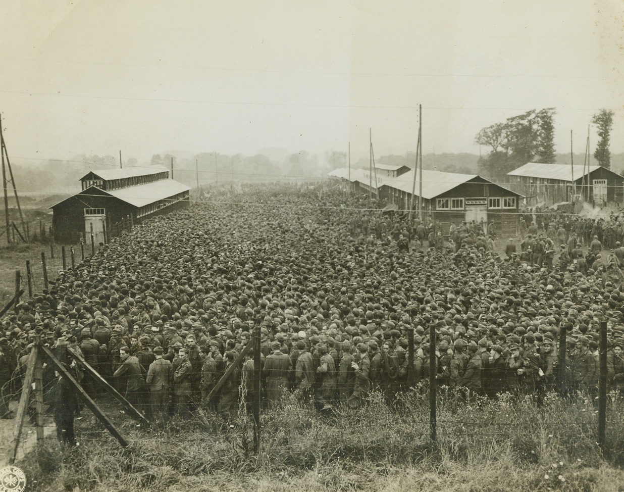 Ten Thousand Hungry “Supermen”, 8/29/1944. France – In this compact mass, stretching far into the background, are ten thousand German prisoners, captured during the Allied drive in France. It’s “chow time” here, and they’re lining up for their lunch in their stockade somewhere in France. Credit: Signal Corps Photo from ACME;
