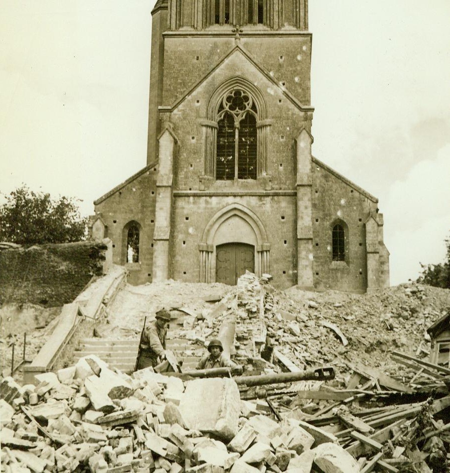 Church Is Haven For German Gun, 8/2/1944. Marigny, France – Pvt. Lowell E. Reau, Green Bay, Wisc. (left), and Cpl. Joseph Rombage, New York City, examine a knocked out German gun which they found amid the ruins of its emplacement outside the church in Marigny. 8/2/44 (ACME Photo By Andrew Lopez, War Pool Correspondent);