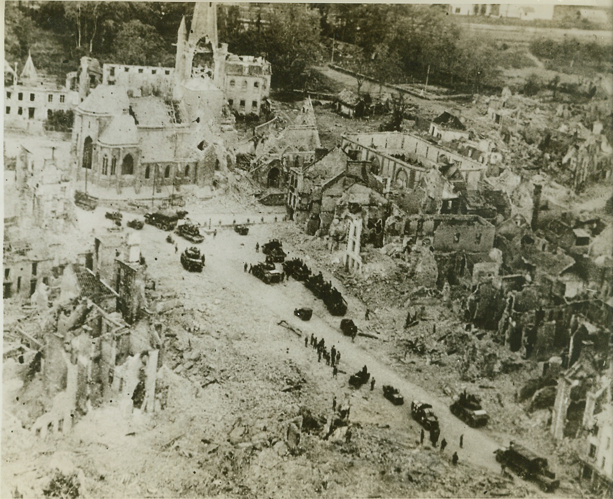Battle-Ravaged St. Lo, 8/8/1944. This airview from an Allied plane shows the terrible extent of damage suffered by St. Lo in the flaming battle for the possession of the Cherbourg peninsula, in France. Credit: (ACME) (WP);