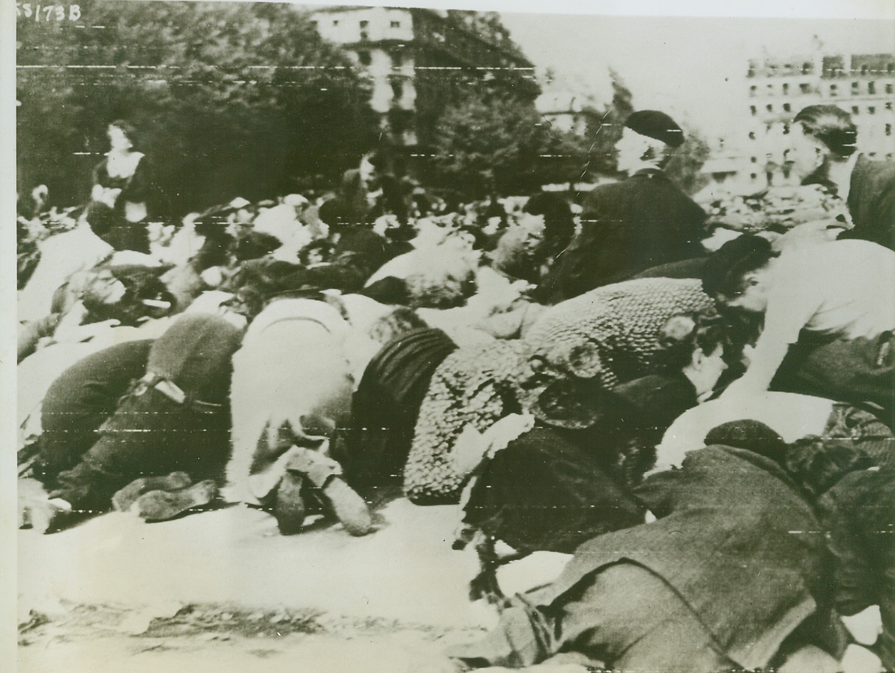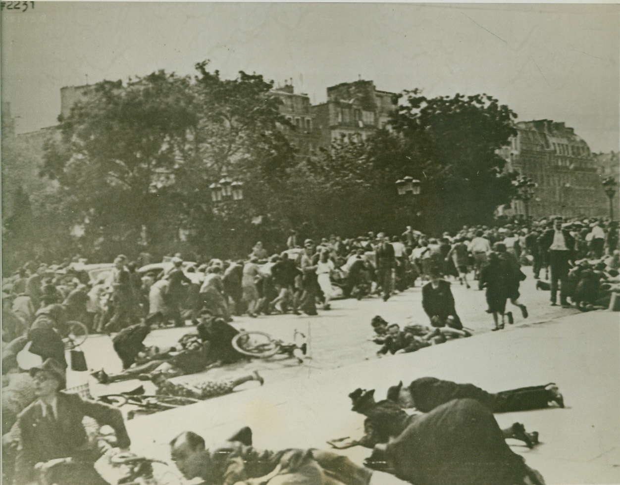 Everybody down, 8/28/1944. Paris—Civilians crouch low in the streets of panic-stricken Paris as sniper fire crackles overhead in the Place de L’Hotel de Ville. Terror reigned as gun shots rang out over the crowds watching the DeGaulle parade celebrating the liberation of Paris. Credit: ACME photo by Andrew Lopez for the War Picture Pool, transmitted via U.S. Signal Corps Radio Telephoto;