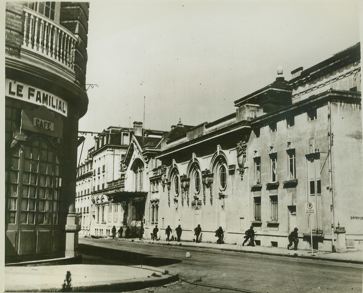 Step-by-Step Advance, 8/21/1944. Dinard, France—Hugging the wall of the casino building in Dinard, American infantrymen crouch as they advance. Making their slow way up the street, the Yanks are wary of German sniper fire. Credit: Signal Corps photo from ACME;