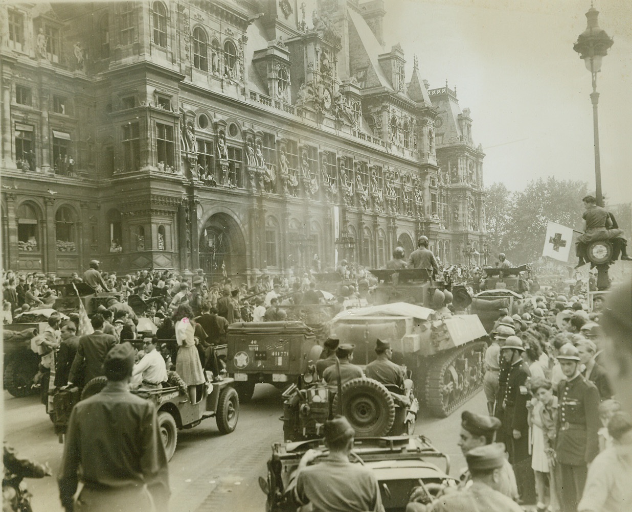Stage Set For Panic, 8/28/1944. Paris—This was the scene in the Place de L’Hotel de Ville before snipers sent a panic-stricken crowd scurrying for their lives during the official reception for General Charles de Gaulle. The street is jammed with Allied armored vehicles and hundreds of celebrating Parisians. At left, spectators jam the windows of the Hotel de Ville, while at right one spectator has climbed to a perch halfway up a lamp post to witness the celebration. Credit: ACME photo by Andy Lopez for the War Picture Pool;