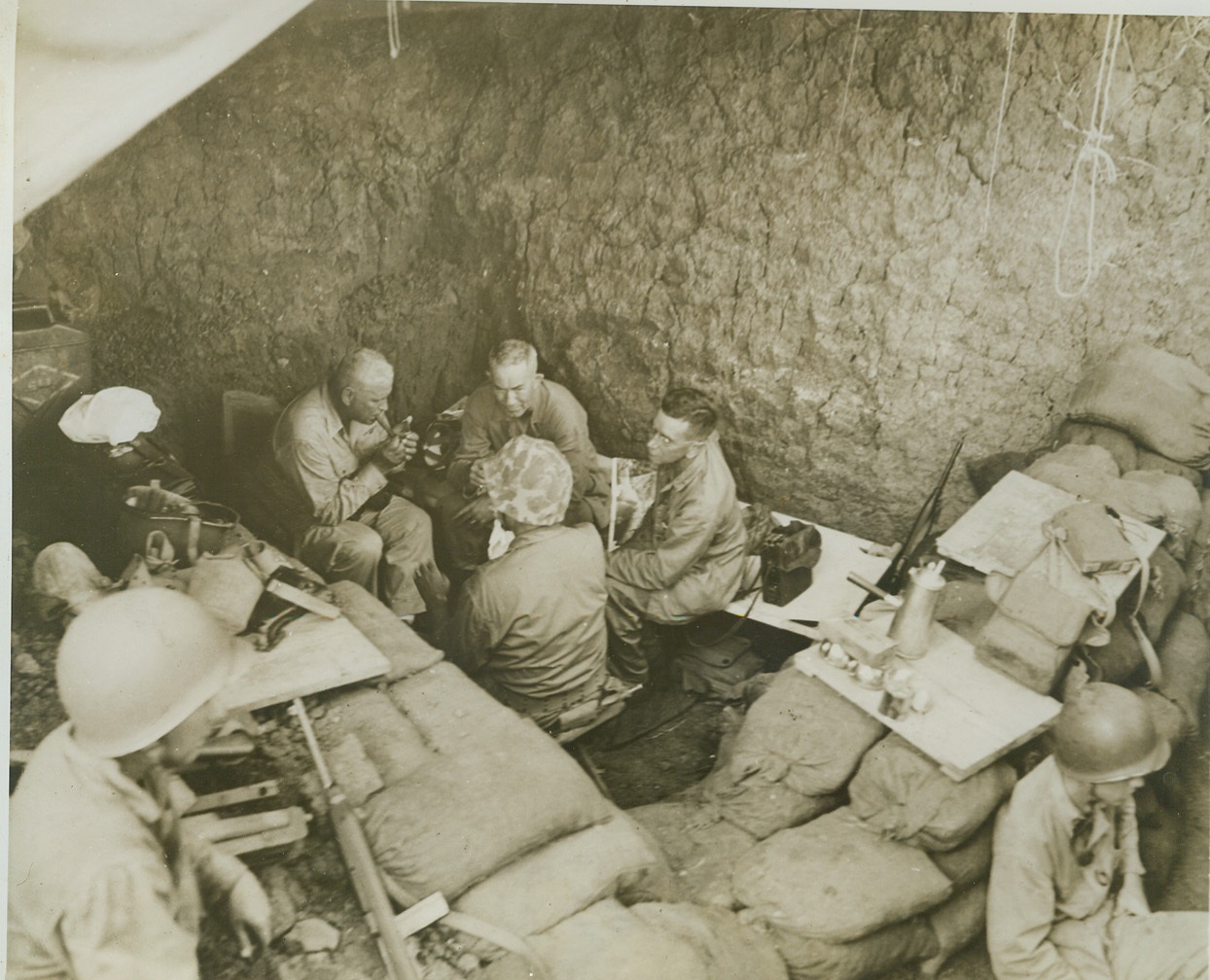 Underground Guam Command Post, 8/22/1944. GUAM — In this super foxhole turned into a command post on Guam, Maj. Gen. Roy S. Geiger (left), commander of Third Marine Amphibious Corps, confers with Maj. Gen. Allen H. Turnage, USMC. Sand bags and alert sentries furnish additional protection against possible Jap interruption of this battlefront strategy huddle. Credit (Marine Corps Photo from ACME);