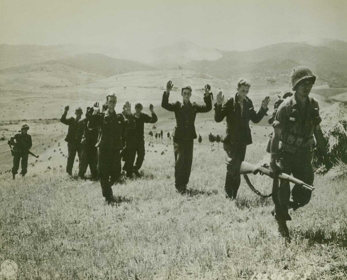 Hands Up – Give Up, 8/7/1944. ORCIANO, ITALY – Holding their hands high, German storm troopers follow their American captors after a short but sharp exchange of fire in the Orciano area. The enemy warriors surrendered to the riflemen of the 100th Infantry Battalion – Americans of Japanese ancestry. Credit Line (Official U.S. Army Photo from Acme);