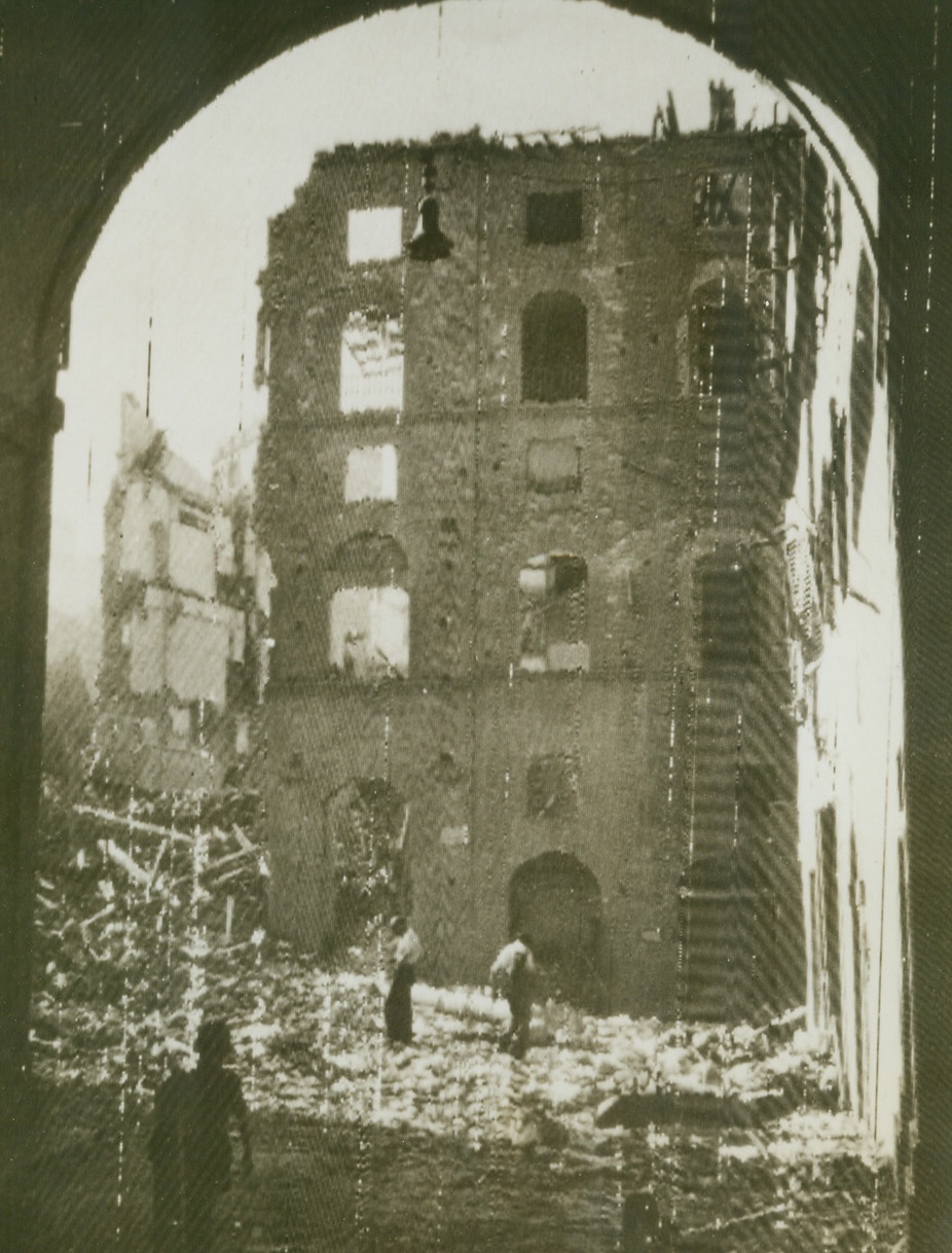 Wrecked Houses in Florence, 8/9/1944. Natives comb through the ruins of buildings in the once-beautiful art center of Florence, after Nazis had abandoned this section of the Italian city. Some of Florence still is in Nazi hands.Credit Line (OWI Radiophoto from Acme);