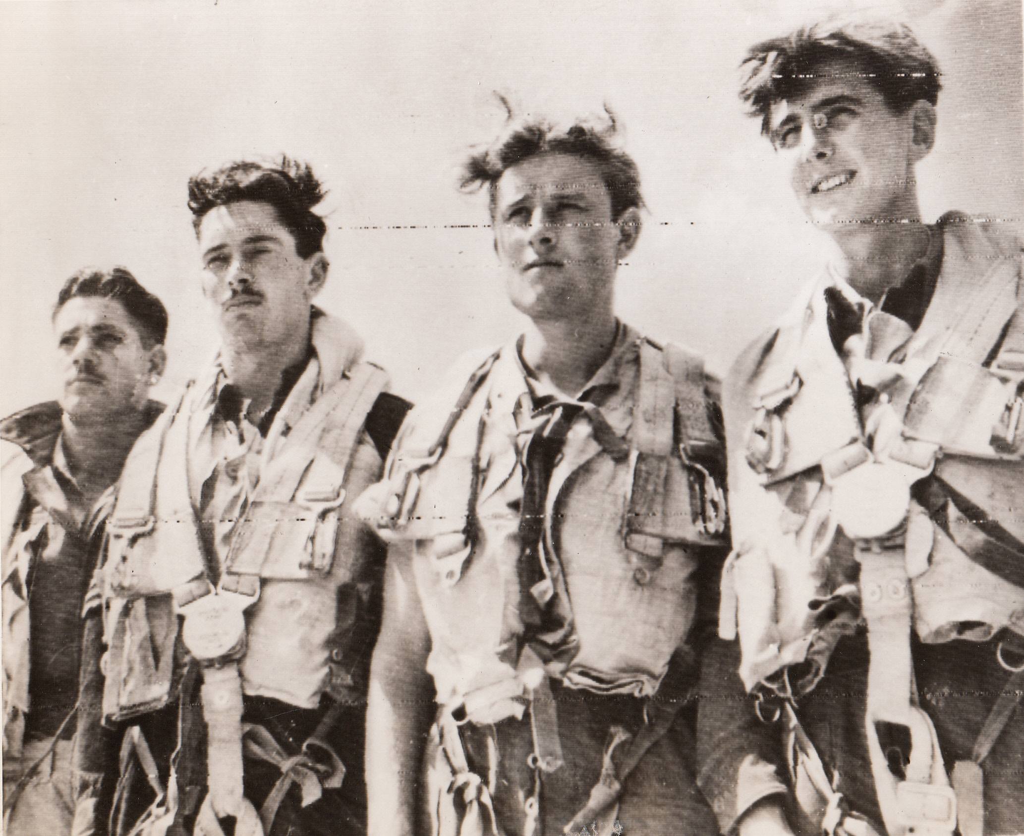 Flew Supplies to Warsaw Patriots, 8/23/1944. ITALY – Back at their base in Italy are these four members of an RAF Liberator crew who recently flew from Italy to Warsaw and back to drop supplies to patriots battling the Nazis in the Polish capitol. They are (left to right): F/S Kenneth Pearce, Sgt. Peter Green, Sgt. Derek Coates, and Sgt. John Rush.;