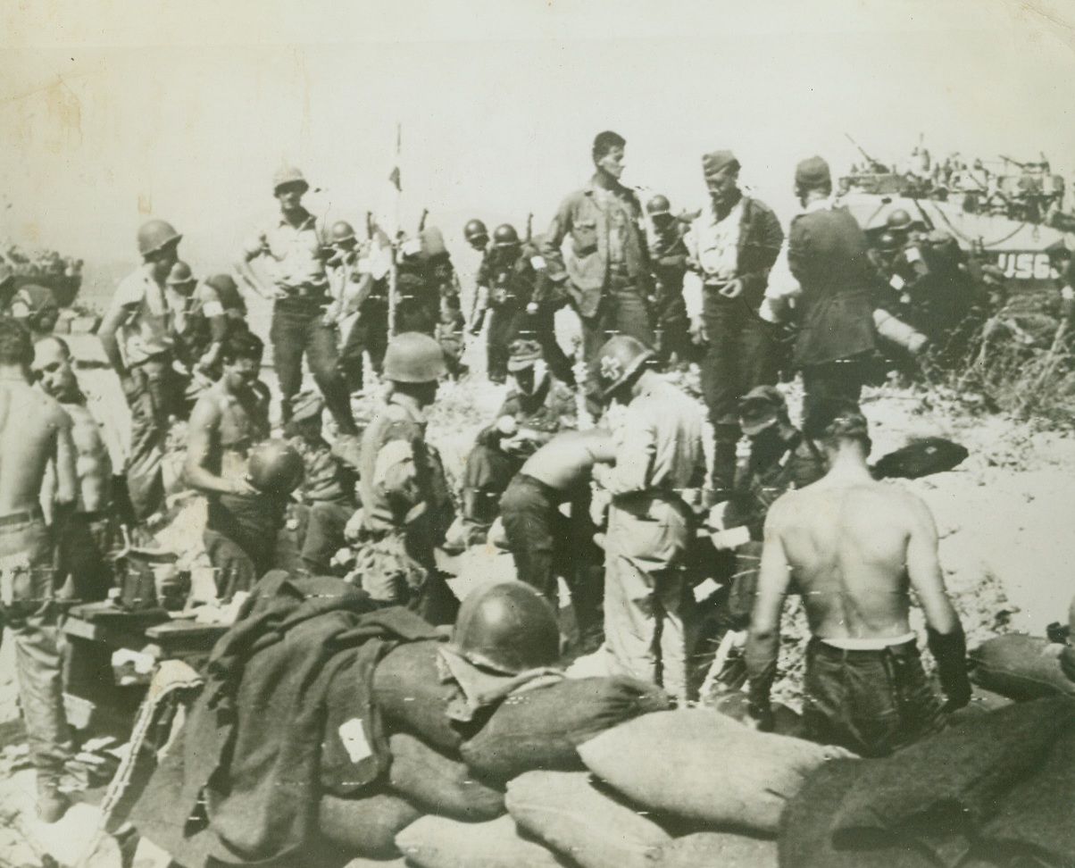 FIRST AID FOR FRIEND AND FOE, 8/16/1944. U.S. Infantrymen and German prisoners receive medical treatment from American corpsmen at a beach dressing station in Southern France, while (background), Yank troops file by on their way to consolidate the new beachhead. Credit: Acme photo by Sherman Montrose for War Picture Pool via Army radiotelephoto;