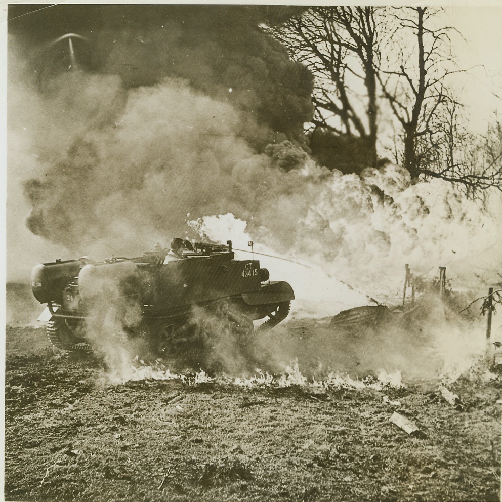 “Wasp” Packs a Flaming Sting, 8/30/1944. Among the powerful flame-throwers now being used by British Armies in France is the ferocious “Wasp”. Sending a fearsome stream of fire into German strongpoints, the flame-thrower is fitting to a carrier with a bullet-proof body. In the “Wasp”, as in all other weapons of this kind, a special type of fuel is used. Credit (British Official Photo from ACME);