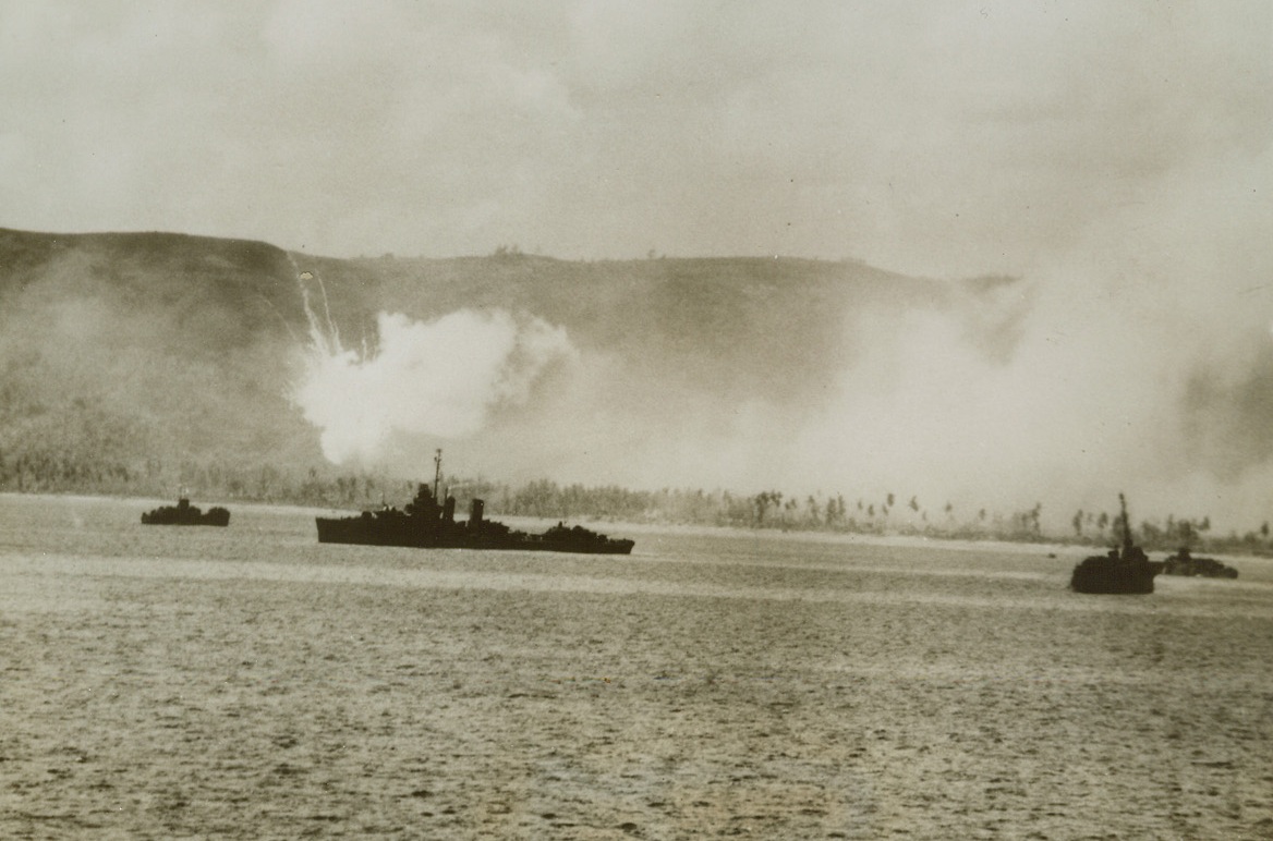 Pre-Invasion Bombardment on Guam, 8/2/1944. Guam Is. – Grey and black smoke rises in huge billows from the shores of Guam, as US Navy guns and planes hammer at the Jap installation on July 21 to soften it for Marine and Army landing forces.Credit: Official US Navy photo from ACME;