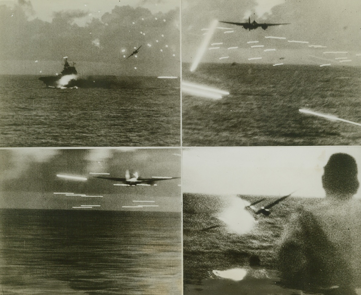 Yank Gunners Down Jap Plane, 8/17/1944. A U.S. Navy photographer, using a camera with a 40-inch lens, filmed the destruction of a Jap plane over Guam, last June 19. At the top, the Nip roars along over an American aircraft carrier. In the center photo, sharp-eyed Yank gunners on the carrier register a hit on the enemy, and (below) the Jap plane explodes in flame. The plane was 7.000 feet above the carrier. Credit: U.S. Navy photo from ACME;