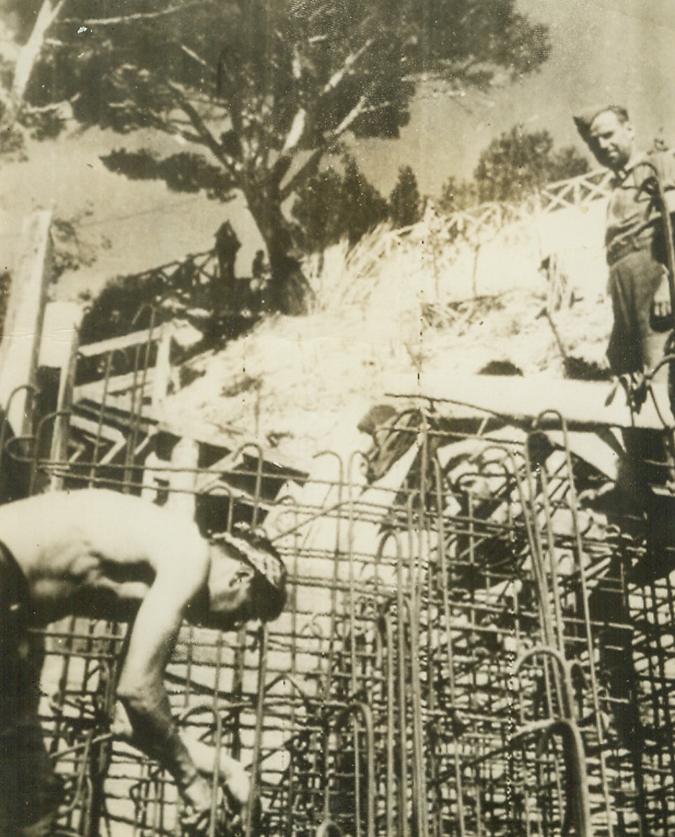 Defenses That Failed, 8/16/1944. France—The German caption describes this photo as “men working on partially completed Nazi defenses along the French Mediterranean coast” where Allied forces staged their surprise landings on August 15th, meeting no united resistance. Photo was radioed toNew York from Sweden today. Credit: ACME radiophoto.;