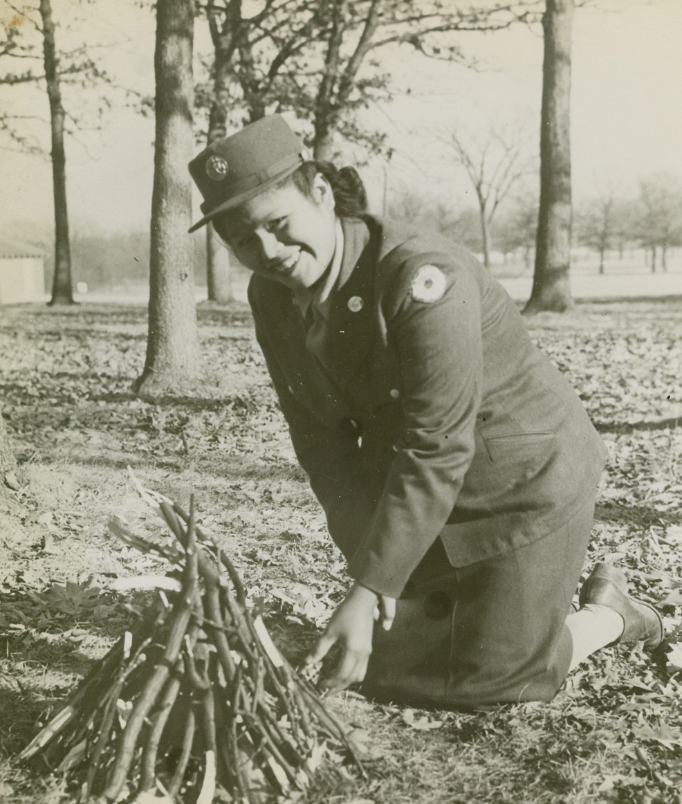 WITH FLINT AND STEEL, 12/3/1943. CAMP GRANT, ILL.—Kathryn N. Butler, Hudson, Wis., first Indian WAC to be stationed at Camp Grant, Ill., where she works in the hospital’s diet kitchen, demonstrates how a modern Indian starts a fire with flint and steel—by using a cigarette lighter.Credit: Signal Corps photo from Acme;