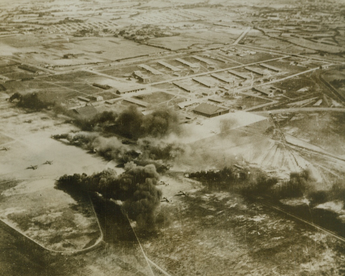 Yanks Hit Japs at Home – (#2), 12/16/1943. Washington, D.C. – This photo, just released in Washington, shows Jap aircraft burning on the Shinchiku Aerodrome on Formosa, during an attack last Thanksgiving Day (1943), by fighters and bombers of the U.S. 14th Army Air Force, which took off from bases in China proper. This photo was taken just after fighter planes swept the target in a low-level strafing attack, which set fire to the Nip aircraft. A short time later, American bombers blasted the airfield and installations with heavy bombs.;