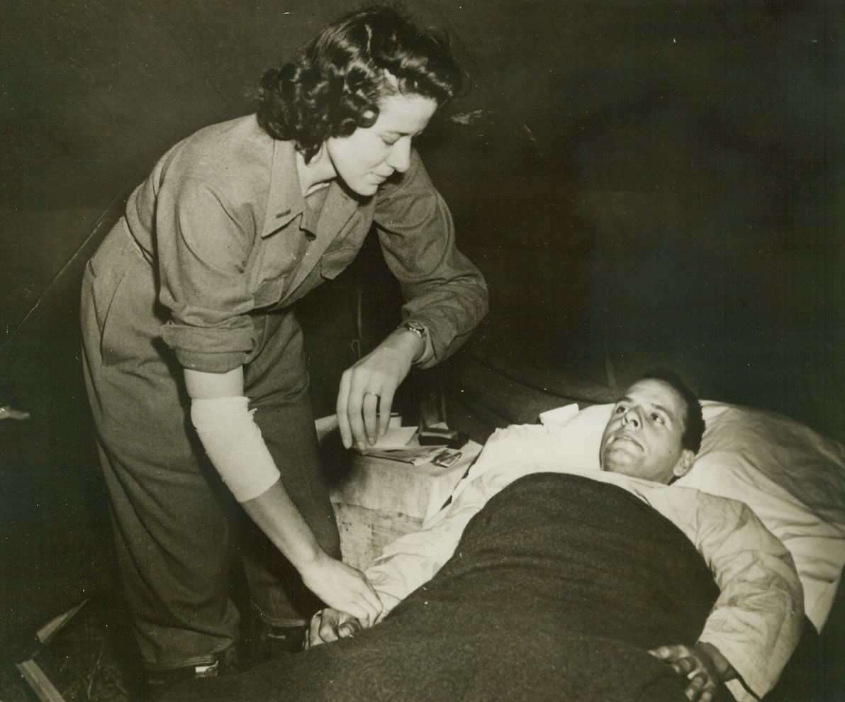 WOUNDED NURSE CARRIES ON, 12/29/1943. AT A FIELD HOSPITAL SOMEWHERE IN ITALY—Lt. Cordelia E. Cooks, first Army nurse in Italy to be wounded by enemy fire, sustaining a shrapnel wound, refuses to take time out to recover. With her arm bandaged she attends a patient, Pfc. Joseph Uhrin, Latrobe, Pa., member of a field artillery unit on the day after she received her wound. Lt. Cooks is from Ft. Thomas, Kentucky.Credit: Signal Corps photo from Acme;