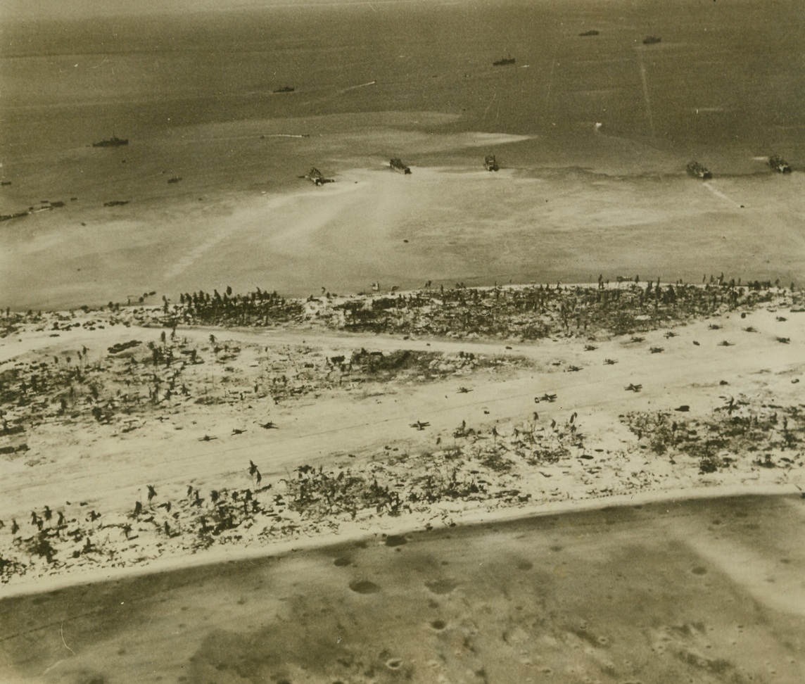 After the Battle at Tarawa, 12/16/1943. CME; Betio Island, part of the Tarawa group, shows considerable evidence of the terrific fire concentrated on it during the battle for Tarawa, by Allied Sea and Air Forces. Shell craters pock the tiny strip of land and the shallow water near it, and palm trees have been stripped of their foliage by the fury of the battle. Planes along the air strip are American planes Credit;