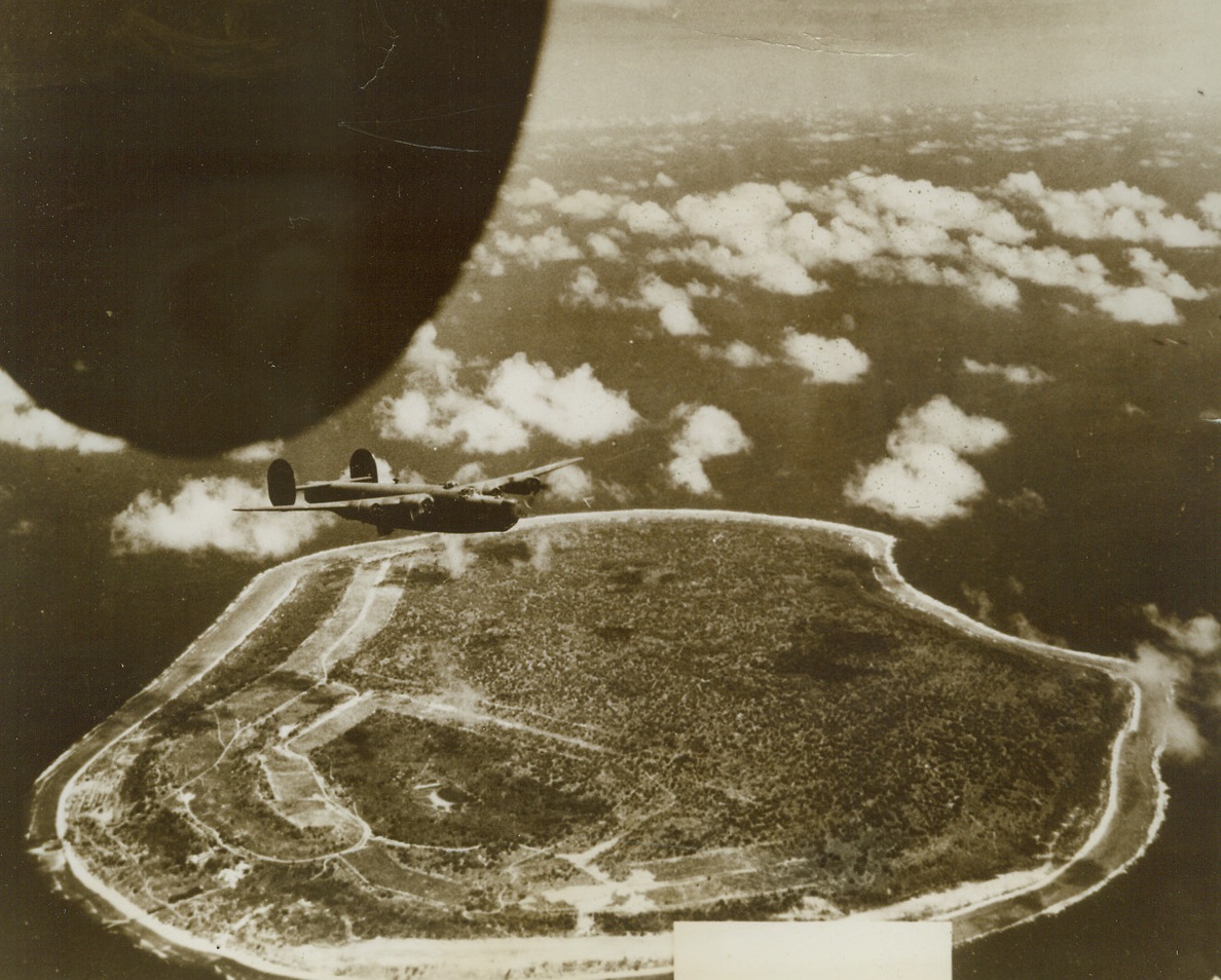 Army Bombers Raid Nauru, 12/5/1943. NAURU—As Yank forces battled for possession of Gilbert Island bases, our airmen winged over Jap-held Nauru Island, carrying out our new offensive in the central Pacific. Here, an American Liberator flies above Nauru in the raid of November 21st. Credit: USAAF photo—ACME;