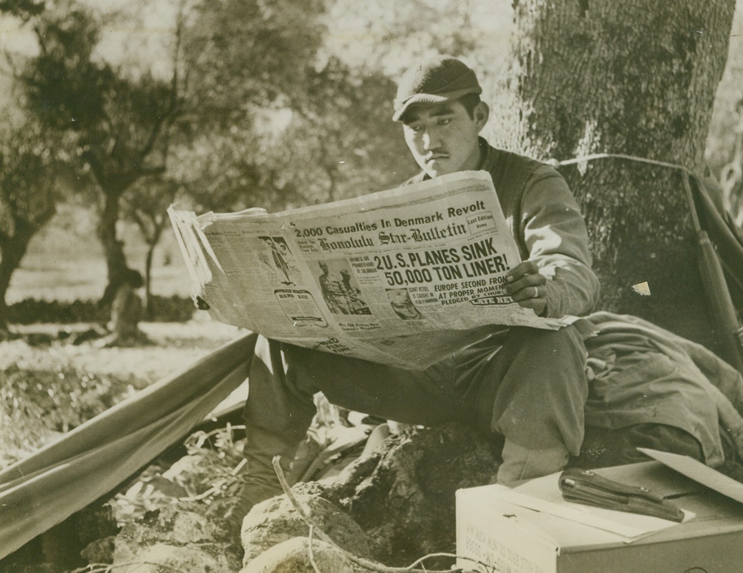 No Title., 12/10/1943. ITALY—You don’t need to ask a unit of Japanese infantry in Italy what they think of the Axis. Daily, they have been giving their lives for Uncle Sam in rough mountain action against the Germans. The U.S. Army unit, which is made up of men who are…theater. Before Pearl Harbor…were in the National Guard in Hawaii, and now they are putting their training to work for America. These photos were taken during a breathing spell when the fighting Japanese-Americans waged continuous warfare for eight days running. Pfc. Isami Tsuda eagerly scans the Honolulu Star bulletin of August 31 for news of home. Not until the Japanese-Americans pulled out of the fighting line for a rest were they able to get any news or mail from their homes. It was the first they’d received since landing in Italy.Credit: Acme;
