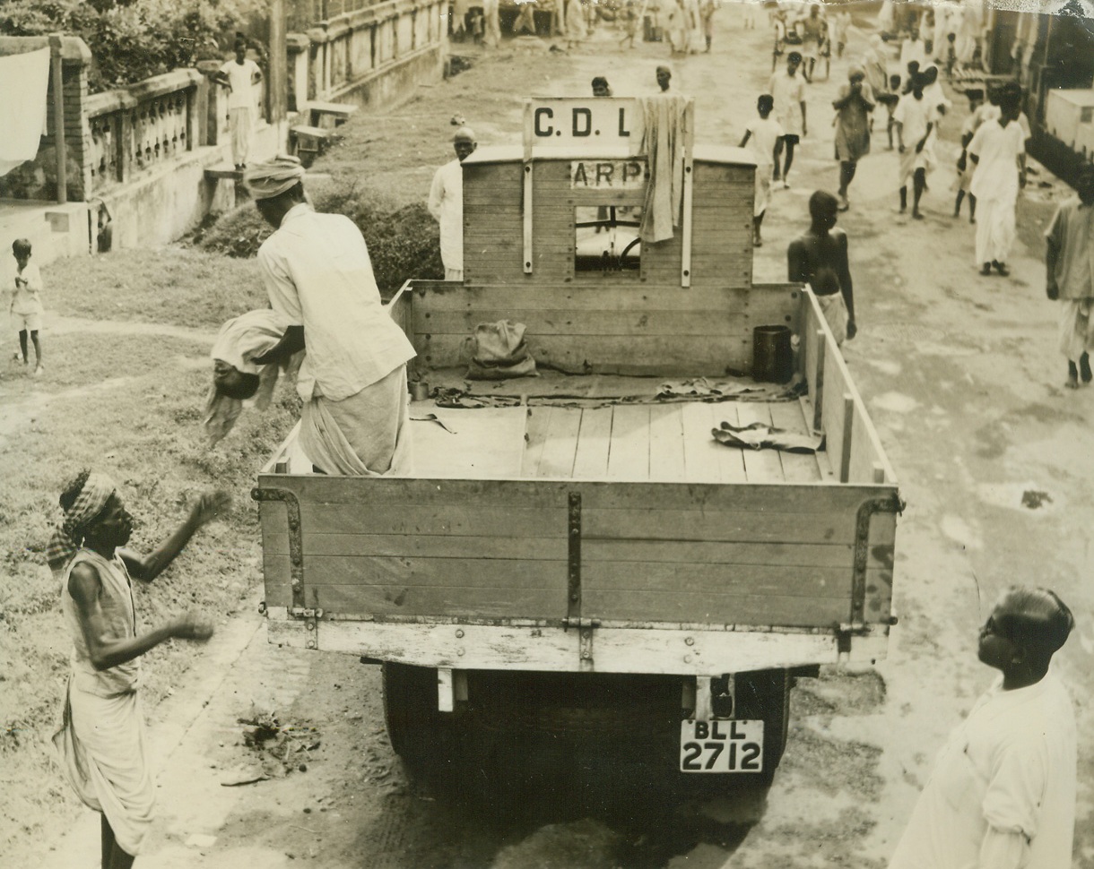 Famine in India, 12/17/1943. By last week, an estimated 1,000,000 persons had died of starvation in India and, although the British government reportedly has the situation under control that number will undoubtedly be raised before the final, tragic count is taken. Just released, these startling pictures were taken in Calcutta at the peak of India’s famine in late October when a homeless army of 100,000 roamed the city, dying in the streets. New York Bureau Regular corpse removal squads were on call in the streets of Calcutta. This wagon bears the letters A.R.P., but death in India came not from the skies but from within. Often, the shriveled dead had to wait for hours to be removed from the street, checked in at the police station, then taken to the ghats for burning. Credit line (ACME);