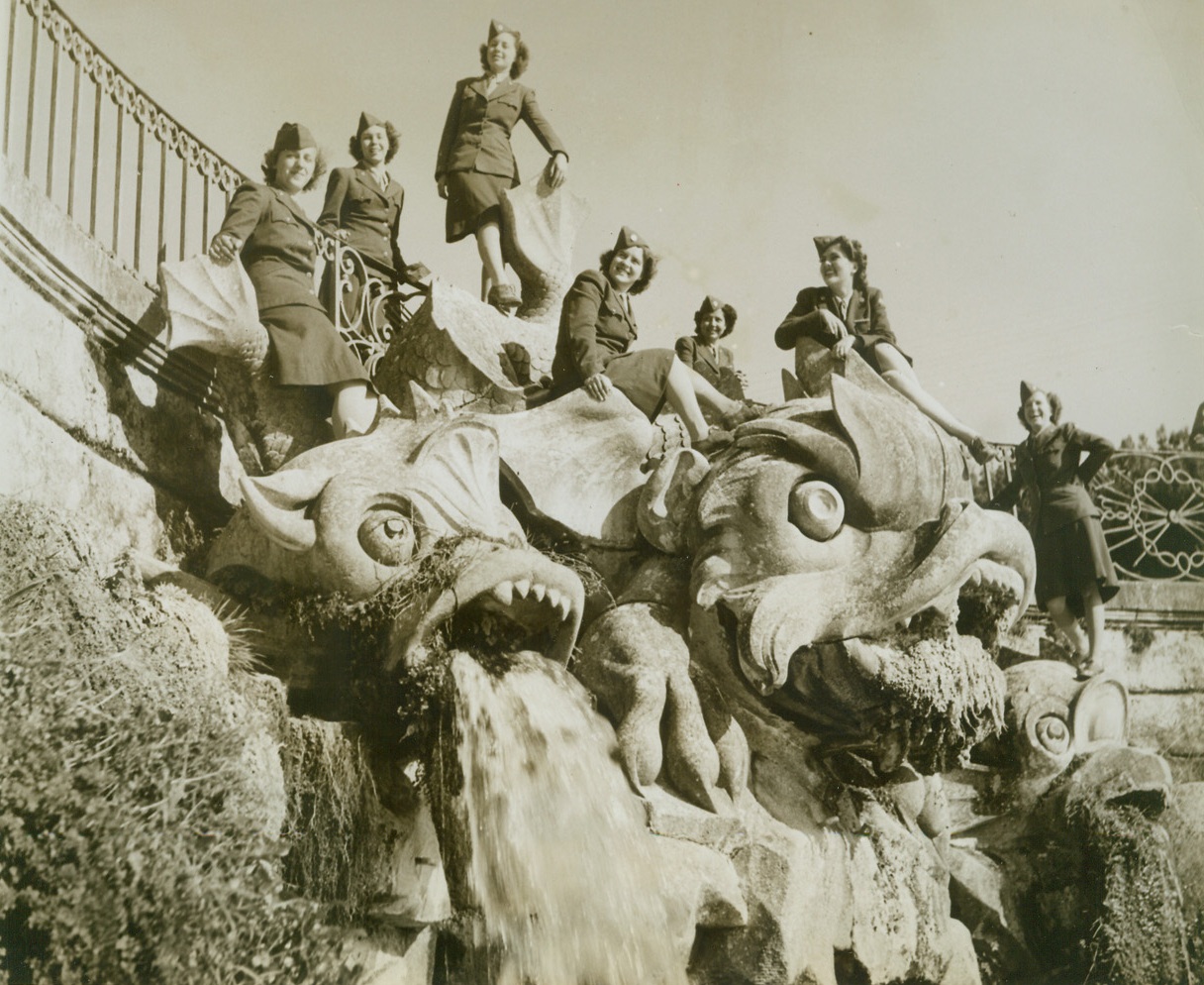 DECORATIVE TOUCH, 12/5/1943. ITALY—A vast improvement is effected in the weird statuary of the royal gardens of Caserta, italy, by seven sightseeing WACS who are (left to right) Pvt. Jeanne Zientek, of Buffalo, N.Y.; Pvt. Jerry Horne, Lucedale, Miss; Pvt. Betty Hoefler, of Buffalo, N.Y.; Pvt. Laura Howleson, of Pittsburgh, Pa.; Pvt. Zanaida Johnson, of New York City; Pvt. Rena Hicks, of Louisville, Ky., and Pvt. Ruby Hale, of Wharton, Tex.Credit: Acme photo by Bert Brandt, War Pool Correspondent;