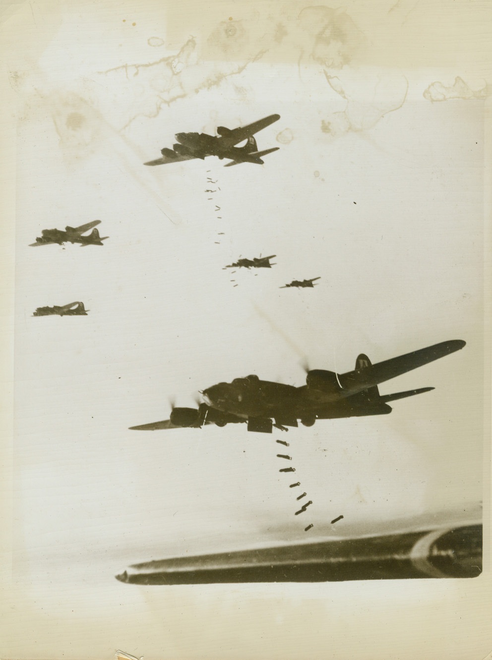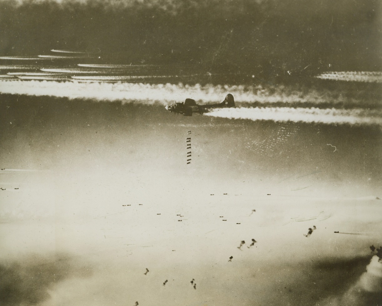 Yank “Calling Cards” For Bremen, 12/15/1943. Washington, D.C. – A stick of ten heavy bombs drops from a Flying Fortress of the U.S. Army Air Forces, in the center of this photo, just released in Washington. Exploding anti-aircraft shells, (bottom, center), and vapor trails, (top) can be seen in the photo which was taken during the heavy all-American 1,000 plane raid on Bremen, Germany, last Nov. 26, during the week when Allied Bombers were blasting Berlin to bits. Credit: U.S. Army Air Forces photo from ACME;
