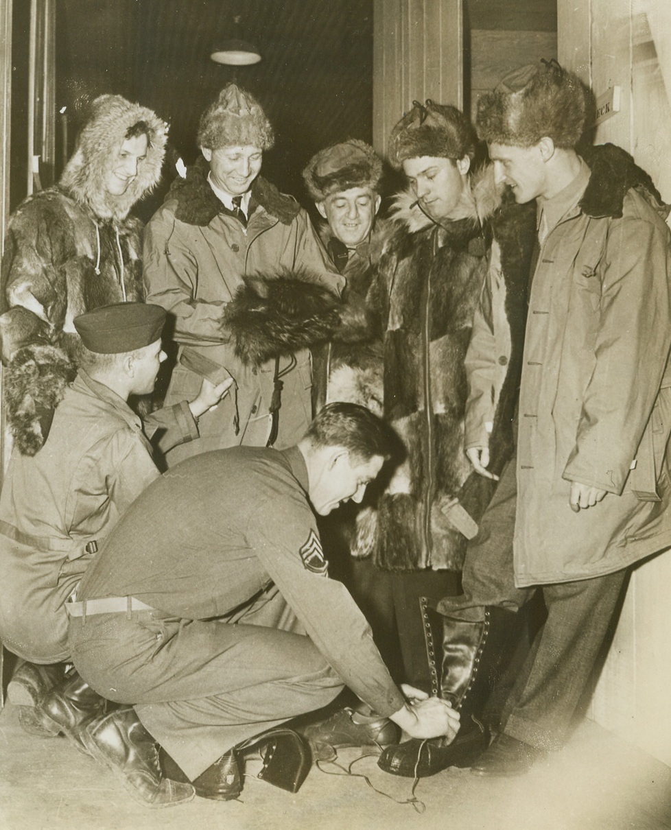 Warm Clothes for Cold Trip, 12/29/1943. Somewhere in Alaska — Ready to tour Alaskan and Aleutian bases to put on exhibition games for our boys up there, these major league diamond stars get outfitted with heavy, warm clothing for their cold trip. Kneeling, Lt. Arthur Tober (left) of Bridgeport, Connecticut, adjusts a parka on Fred “Dixie” Walker, while Sgt. John A. Theoboldt of Monterey, California, fits a pair of shoepacks to Hank Borowy. Left to right, the baseball players are Stan Musial of the St. Louis Cards; Dixie Walker of the Brooklyn Dodgers; Frankie Frisch, manager of the Pittsburgh Pirates; Danny Ditwhiler of the Cards; and Hank Borowy of the New York Yankees. Credit: ACME;