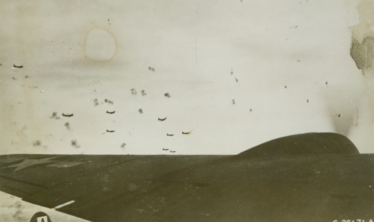 “Flak Garden” Doesn’t Stop Fortresses, 12/9/1943. This photo, just released in the United States, shows a formation of flying fortresses of the U.S. Army Air Forces, as they passed through clouds of bursting anti-aircraft shells, on their way to bomb the Nazi communications center at Munster, Germany, last Armistice Day. Credit: U.S. Army Air Forces photo from ACME.;