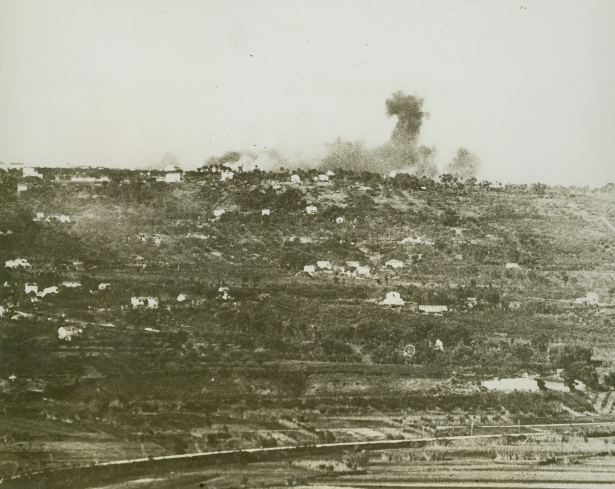 “Excellent Bombing”, 12/3/1943. LANCIANO, ITALY – Allied bombardiers won another round of praise after their recent bombing of roads and enemy-defended positions on the Sangro River front. The marksmanship behind the bomb bursts shown here, at Lanciano, won a report of “excellent bombing” from the Eighth Army. Photo radioed to New York from Algiers. Credit Line (ACME Radiophoto);