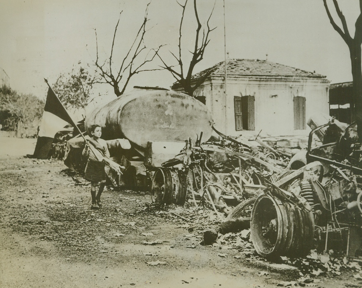 Even the Children Helped, 12/10/1943. CORSICA—Proudly bearing the tricolor of France which he rescued from a ruined building, a youngster of Bastia parades past a pile of wrecked German Machines on the quayside. Young and old helped to bout the Nazi invader from the island of Corsica, and the victory over the Germans was one of the people. Credit: OWI photo from ACME.;