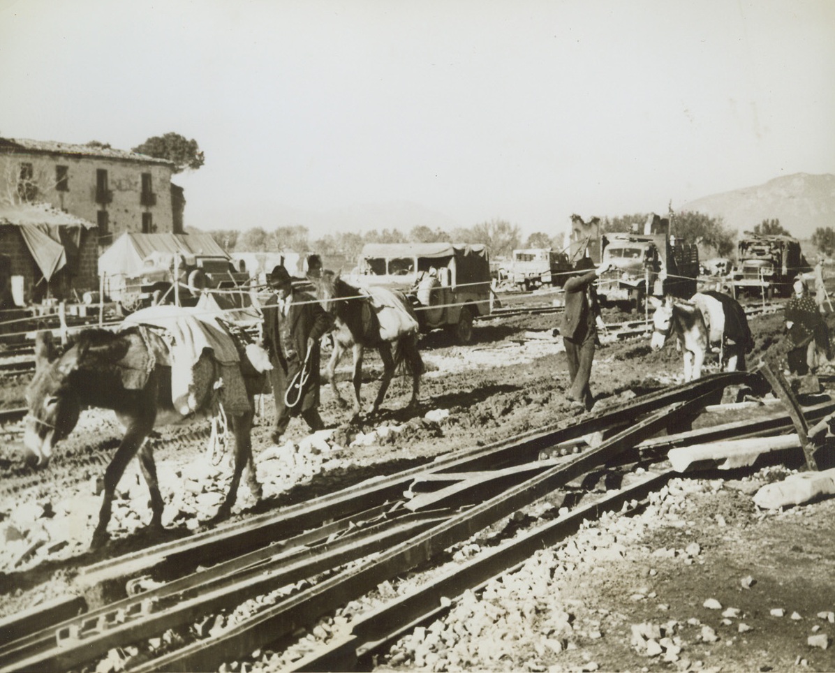 RAILROAD BED BECOMES HIGHWAY, 12/19/1943. SOMEWHERE IN ITALY—Their few possessions strapped to the backs of mules, Italian civilians lead the beasts along a railroad bed that now serves as a highway. Wrecked by the Germans, the rocky road bed was converted to a highway by the Allies as they made their way north, in pursuit of the Germans.Credit: Acme;