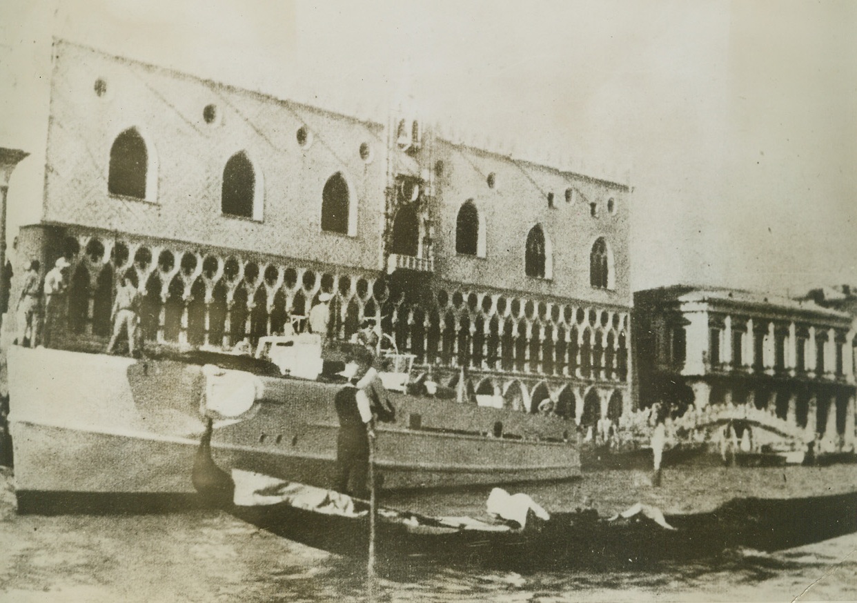 WARTIME “GONDOLA” IN VENICE, 12/13/1943. The historic beauty of Venice’s canals, had been marked by the grimness of war and here in this photo from a neutral source, a German gunboat can be seen anchored near the Doge’s Palace in Venice, alongside a gondola (right foreground) waiting for hire. Credit: Acme;