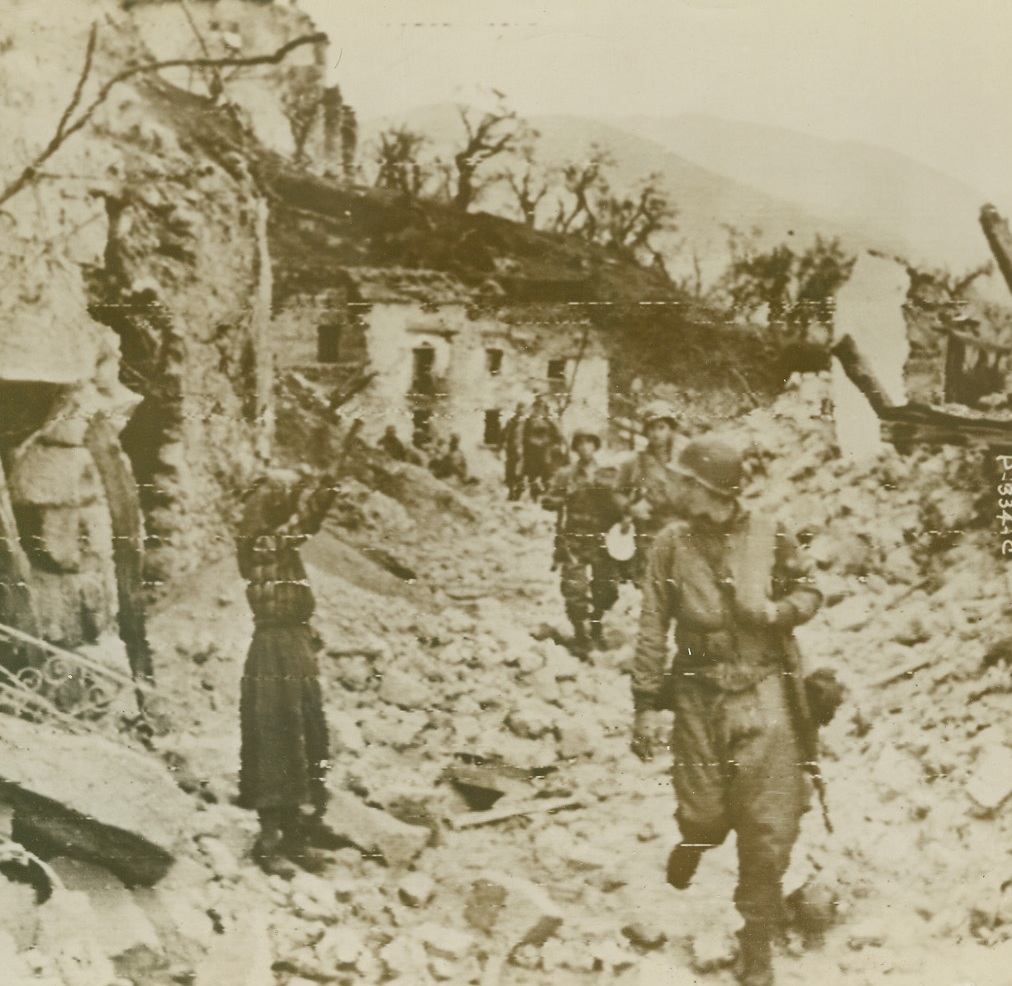 HAIL THE CONQUERORS!!!, 12/21/1943. SAN PIETRO, ITALY—Advancing Yanks receive first greeting from a native woman standing amid a debris-covered street outside her cellar shelter as they enter San Pietro. Credit: Signal Corps radiotelephoto from Acme;