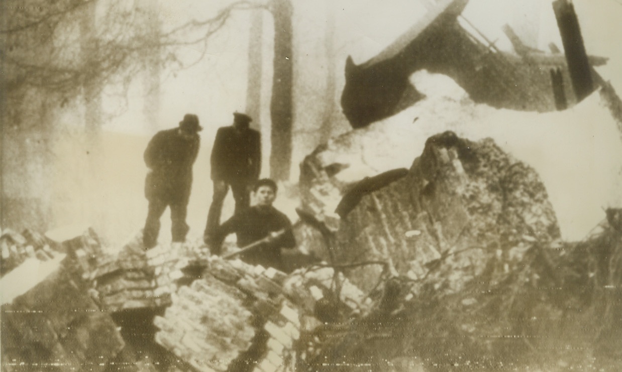 Carry On, Mates, 12/28/1943. A U.S. flying fortress (lower right) is brought to earth, its tail piece following, as other of the giant planes continue to unleash bombs over Bremen, Germany. The 8th Army Air Force bombers leave their contrails in the flak filled sky, where more devastation goes hurtling downward than is tossed up from Nazi guns. Credit: U.S. Army Air Force photo from ACME.;