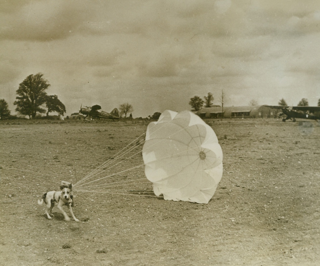 What’s In A Breed?, 12/7/1943. ENGLAND – Although his breed is uncertain, this spunky terrier is chock full of the stuff that heroes are make of. Called “Salvo” by the Airmen for whom he is a mascot, the dog goes on operational flights and makes parachute jumps whenever his masters take to the silk. Landing after a jump, Salvo plants his feet firmly on the ground, to resist the pull of his billowing chute, until someone comes along to unharness him.Credit: U.S. Signal Corps photo from ACME;