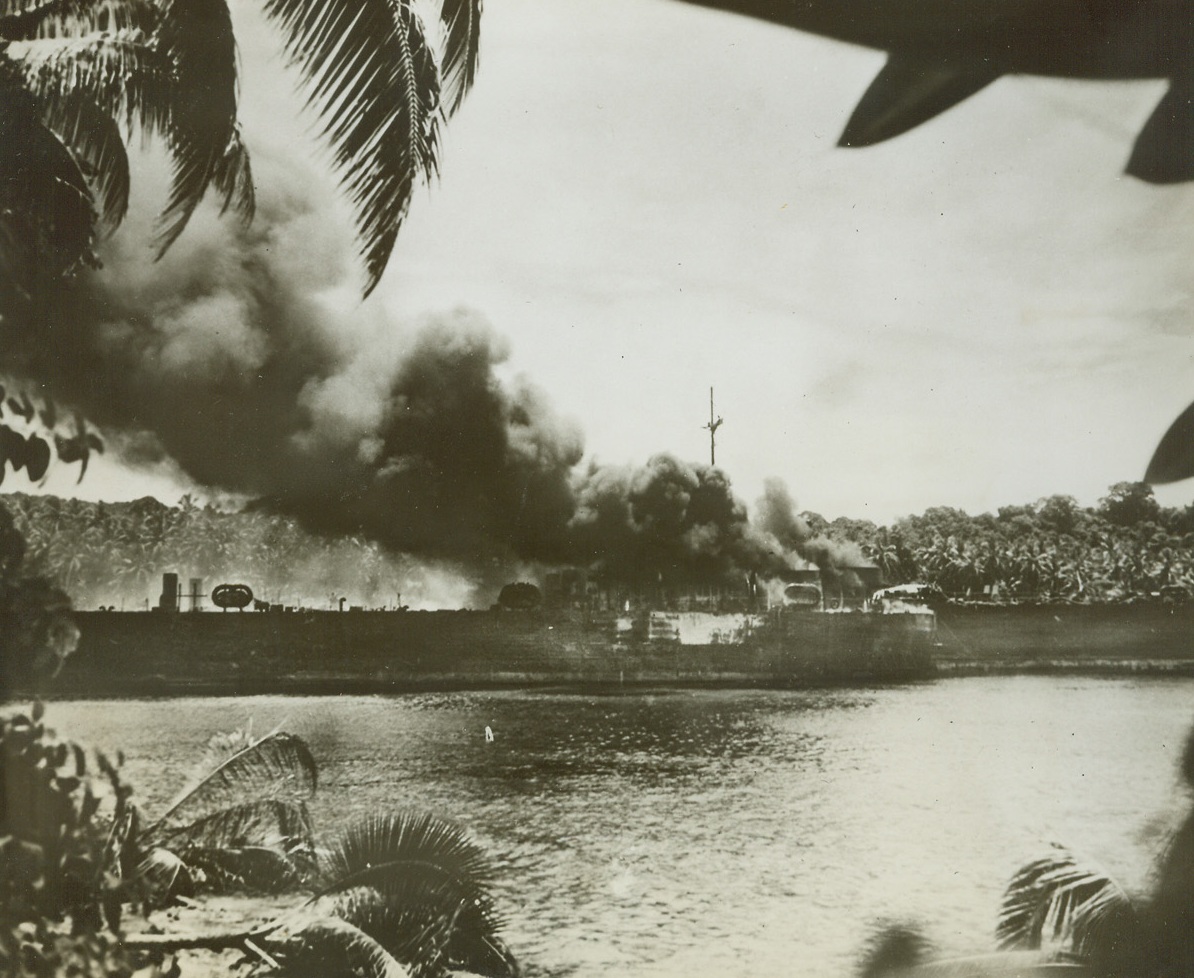 One for the Nips, 12/29/1943. South Pacific – Smoke pours from the blistered stern of an Allied LST (Landing Ship-Tanks), after a Japanese plane scored a hit during an attack on a South Pacific island in the combat zone where the LST was unloading its cargo. A sister ship (right background) stands by as its crew plays a stream of water on the burning vessel. Credit: U.S. Marines Corps photo from ACME;