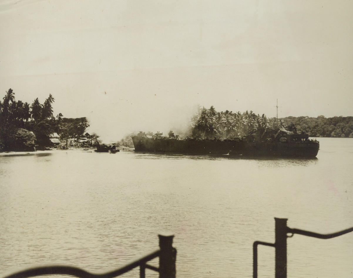 Small in Size but Big in Importance, 12/24/1943. South Pacific – A direct hit by a Jap gun on our beachhead shrouds the bow of an American LST in smoke as we seize Mono Island in the Treasury Group, October 27. Backed by long planning, the quick capture of the Central Solomons Island demonstrated that when Jap forces are small and ill-prepared, we can move with the same terrorizing speed that the Nipponese enemy once did. After a terrific bombardment by U.S. Destroyers, American and New Zealanders killed or captured the majority of the 200 to 300 Japs within 14 hours. Credit: Official U.S. Navy photo from ACME;
