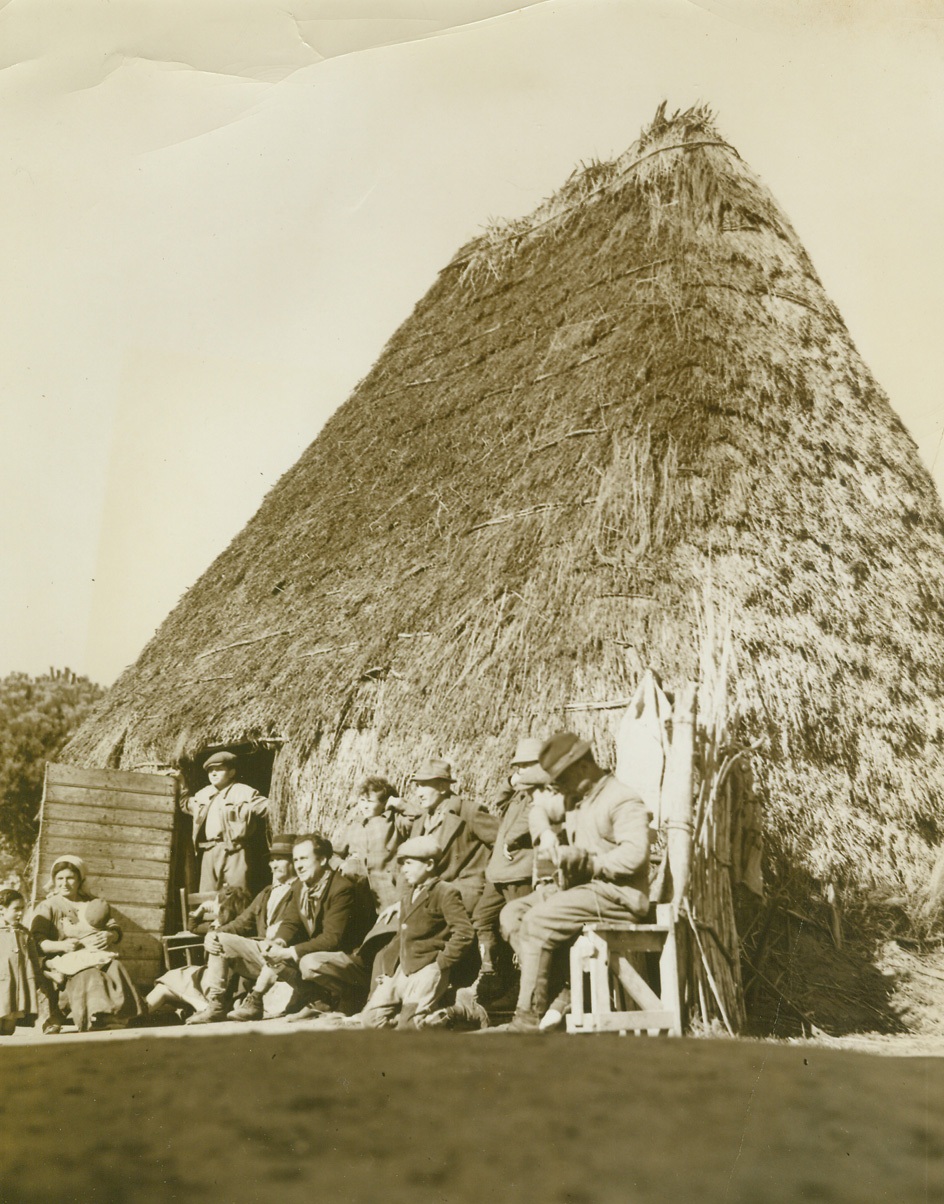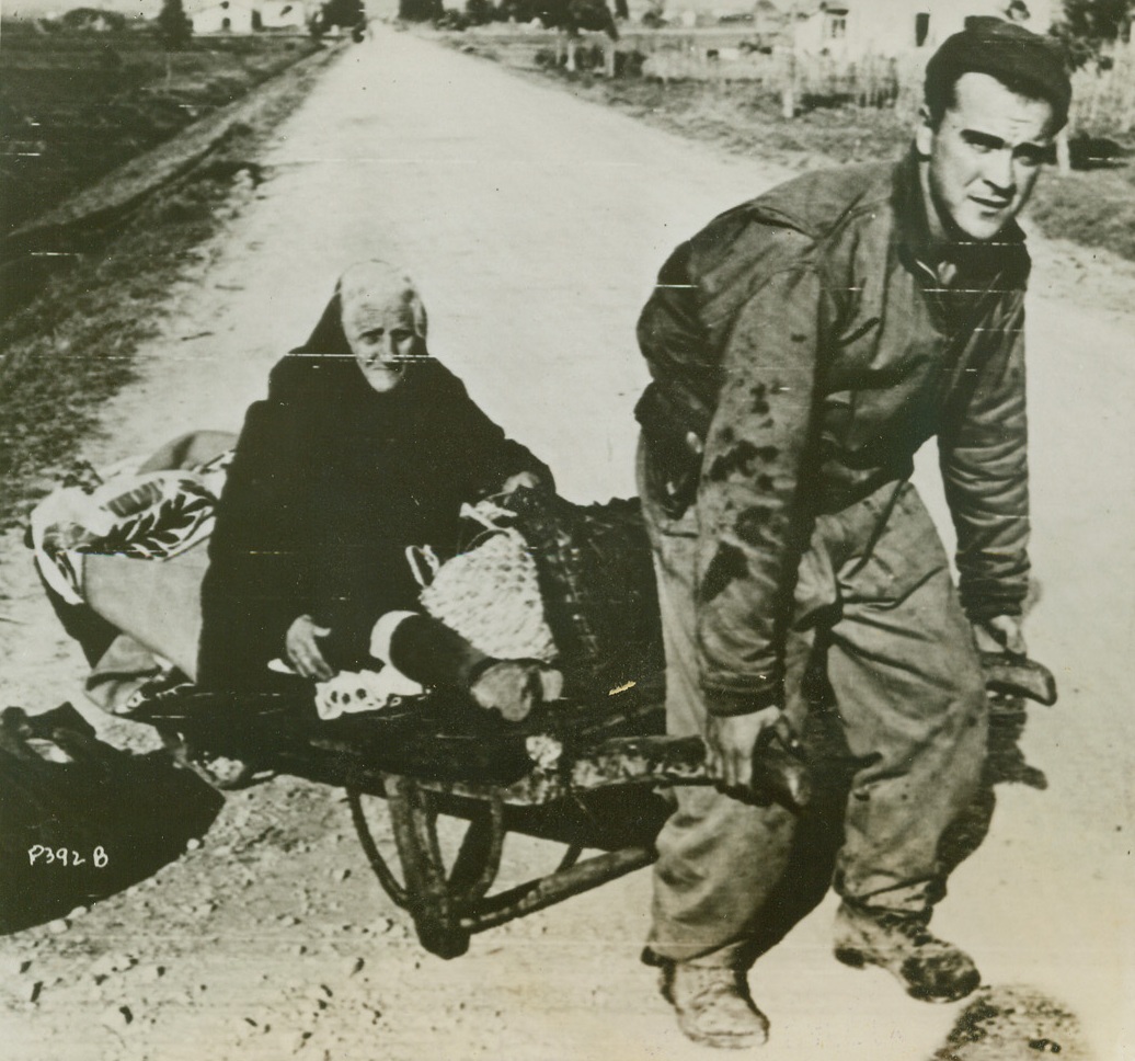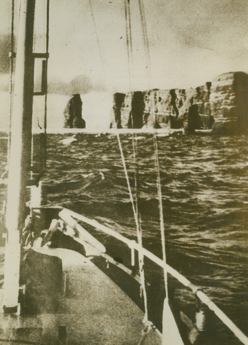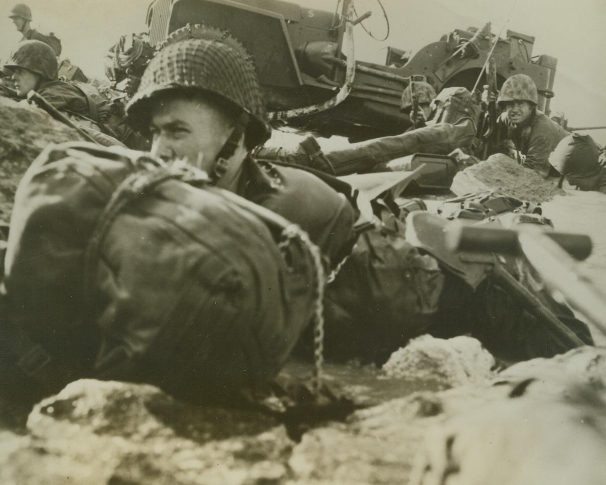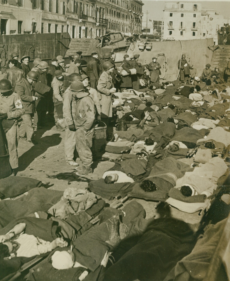 Battered at Beachhead, 2/11/1944. ITALY – Injured fighters who are able to walk, watch their more seriously wounded comrades being loaded aboard a warship off the Anzio-Nettuno beachhead. The shore may be seen, dimly, in the background.Credit Line (ACME);