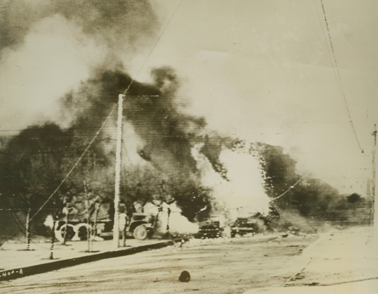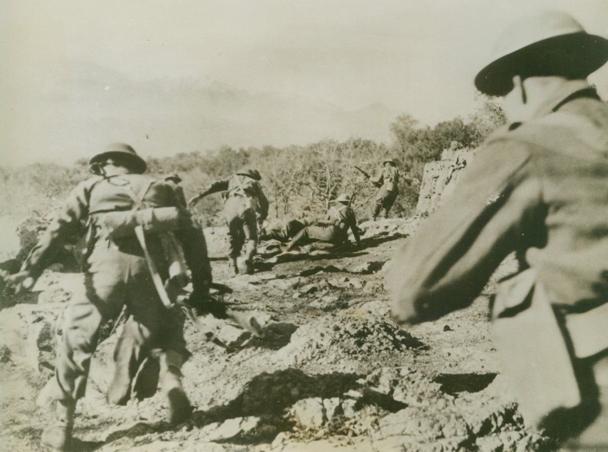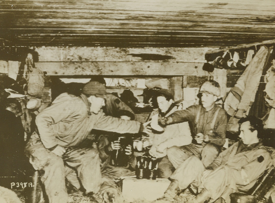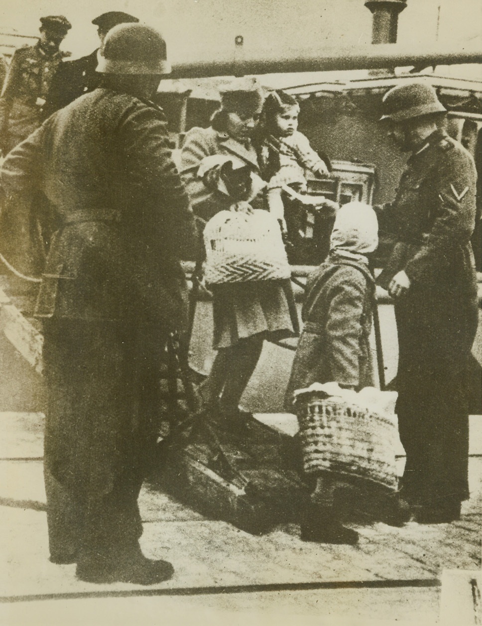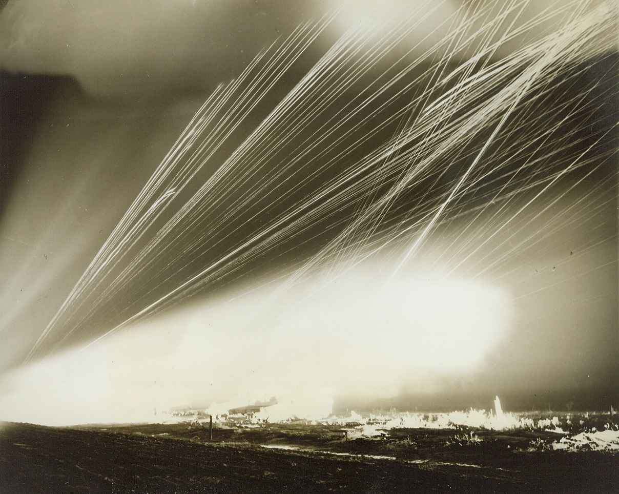 Battered at Beachhead, 2/11/1944. ITALY – Injured fighters who are able to walk, watch their more seriously wounded comrades being loaded aboard a warship off the Anzio-Nettuno beachhead. The shore may be seen, dimly, in the background.Credit Line (ACME);