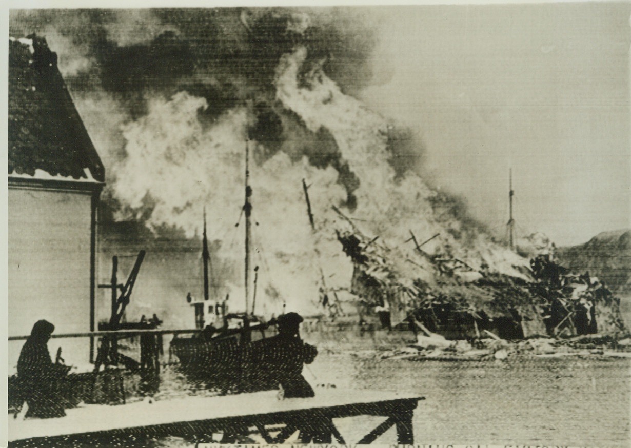 Flames and smoke, 2/1/41 LONDON — Flames and smoke shoot skyward from an oil factory set afire by British soldiers who invaded Vaagso in German-occupied Norway on December 27. In the foreground the British hold a jetty against snipers. British sources stated that Commandos took part in the raid. Credit: (ACME Cablephoto);