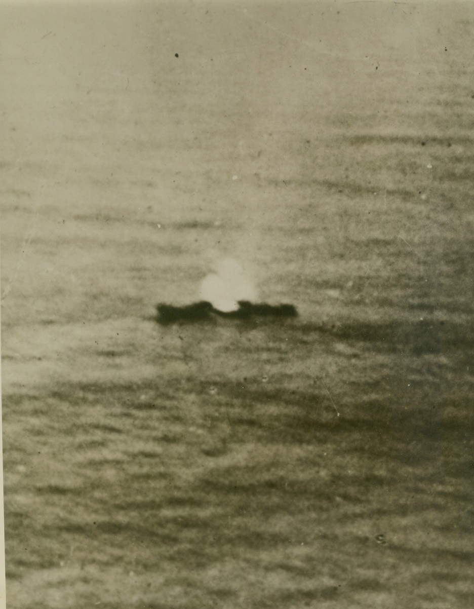HOW GERMANY WARS ON BRITISH SHIPPING FROM AIR, 3/16/41 GERMANY – The stricken British freighter settles beneath the waves, a cloud of smoke marking her resting place, according to the German censor-passed caption on this picture of how long-range German bombers are striking at Britain’s shipping lifeline. Credit: ACME;