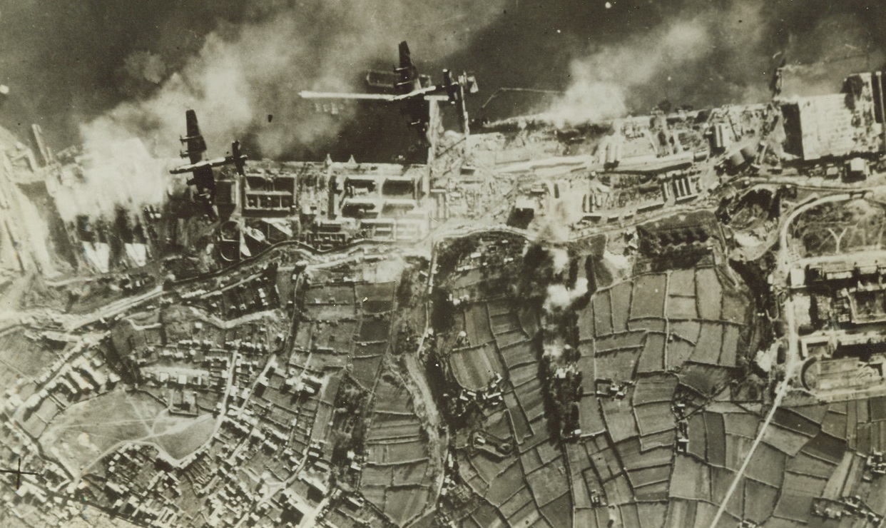 Daylight Raid on Brest, 1/3/1942. Brest – Here is an air view of the recent daylight bombing of Brest. Two 4-motored Halifax Bombers of the RAF Bomber Command can be seen pressing home their attack on the German Pocket Battleships Sharnhorst and Gneisenau, which were in drydock (at left). The Germans sent up a smoke screen in an effort to obscure the target. It wasn’t very effective. Passed by British Censor Credit: ACME;