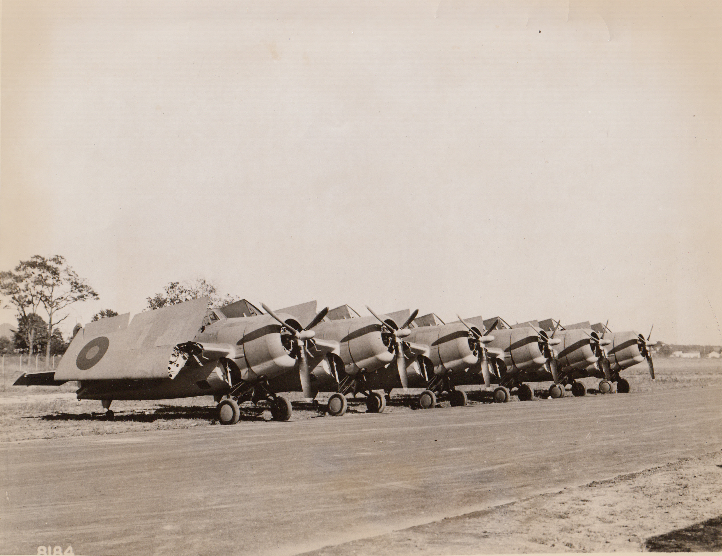 More Parking Space, 1/13/1943. New York—Seven Grumman “Wildcats” line up to give a graphic demonstration of the value of the plane’s famous folding wing. Photo shows how five planes with folded wings can be stored in the same space that two, with fixed wings, require. Adoption of the “Wildcats” for US Navy and Royal Navy Carriers has practically doubled the number of planes they can carry and has given both Navies a tremendous advantage over enemy carriers of comparable tonnage. Passed by censors.Credit: ACME.;