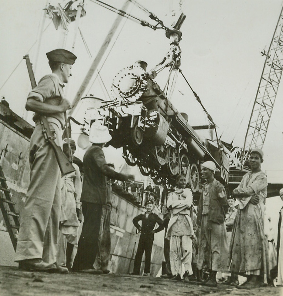 No Title, 1/19/1943. This American Baldwin locomotive, built specially for use in foreign lands, is loaded aboard ship. The engine had reached the port on another vessel and is being transshipped to another port. This photo has just been received in New York.Passed by censors.Credit: ACME.;