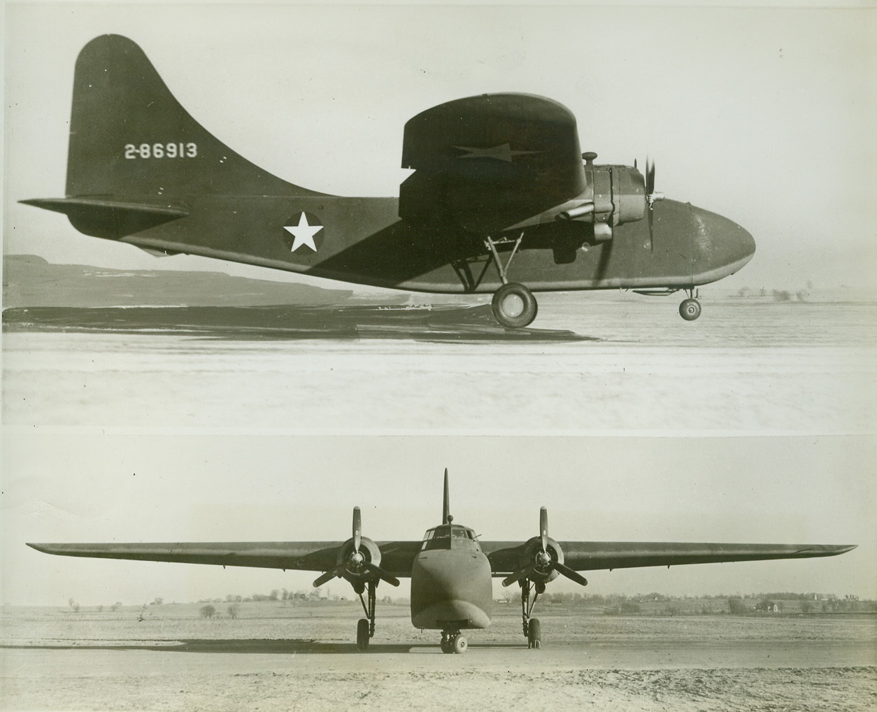 Wooden Army Air Freighter Passes Test, 1/6/1943. St. Louis—Two views of the Curtiss-Wright Caravan, America’s first military plane built specifically for carrying freight and made of plastic plywood, after a successful test flight at St. Louis. Credit: ACME;