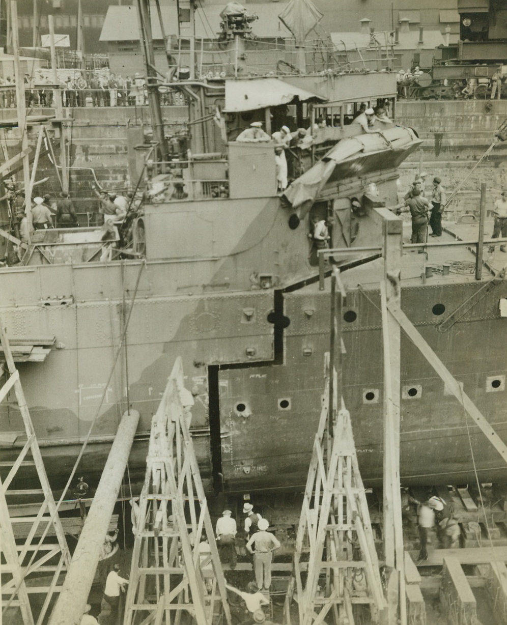 Minus a Bow-But Still Afloat, 1/7/1943. Somewhere in the Carribean—Minus a bow, but still afloat, the torpedoed U.S.S. Blakeley labors her way to a Carribean port for temporary repairs on her way home. Although she was one-fifth demolished when an enemy torpedo hit her last May, the old four-stacker destroyer is back at sea again, doing her job for Uncle Sam. Workmen accomplished a remarkable feat, repairing the vessel by cutting the entire bow off the Taylor, a sister ship to the Blakeley, and “grafting” it onto the bowless destroyer. Credit: U.S. Navy official photo from ACME.;