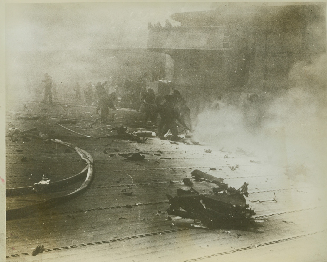After Jap Plane Hit “Hornet’s” Deck, 1/12/1943. Crew members of the U.S. aircraft carrier Hornet, battle desperately against long odds to put out a fire started when a Jap bomber suicide-dived into the warship’s signal bridge, in this photo released by the Navy in Washington today. Wreckage from the bomber covers the ship’s flight deck. Picture was taken during the battle of the Santa Cruz Islands, Oct. 26, 1942, when the carrier was so badly damaged it later had both sunk by other American warships. Credit: (U.S. Navy Photo from ACME);